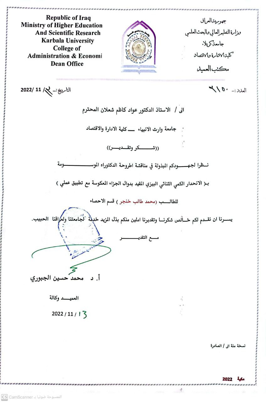 عميد كلية الادارة والاقتصاد جامعة وارث الأنبياء رئيس لجنة مناقشه شارك الاستاذ الدكتور عواد كاظم الخالدي في عضويه مناقشة اطروحة الدكتوراه للطالب محمد طالب خنجر لا طروحته الموسومة (الانحدار الكمي الثنائي البيزي المقيد بدوال الجزاء المعكوسة مع تطبيق عملي) وذلك في يوم الاثنين المصادف ٢٠٢٢/١١/١٣ في جامعة كربلاء كلية الإدارة والاقتصاد قسم الاحصاء.اذا تألفت لجنة المناقشة من الاساتذة المدرجة اسمائهم أد عواد كاظم الخالدي رئيساأ.م.د صباح حسين عضواأ.م.د ايناس عبد الحافظ عضواأ.م.د احمد معين عضواوبعد مناقشة مستفيضة تم منح شهادة الدكتوراة ..فكل التوفيق والسداد للباحث والمشرف وللجنة المناقشه