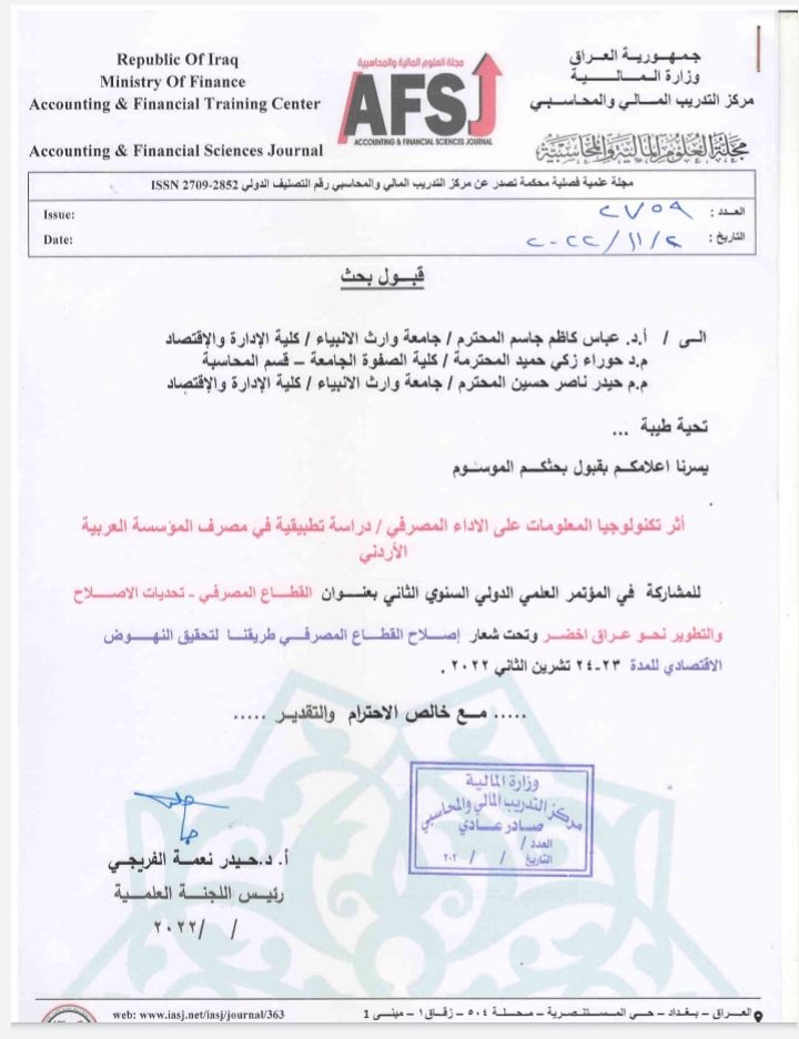 تدريسي في كلية الادارة والاقتصاد / جامعة وارث الانبياء.ع. يشارك في مؤتمر علمي دولي في وزارة المالية العراقية.شارك (م.م حيدر ناصر حسين الميالي) التدريسي في كلية الادارة والاقتصاد/ قسم المحاسبة في المؤتمر العلمي الدولي الثاني بعنوان (القطاع المصرفي تحديات الاصلاح والتطوير نحو عراق اخضر) الذي نظمه مركز التدريب المالي والمحاسبي في وزارة المالية العراقية والبنك المركزي العراقي / بغداد للفترة من 23-24/ 11/ 2022 بالبحث الموسوم (اثر تكنولوجيا المعلومات على الاداء المصرفي – دراسة تطبيقية في مصرف المؤسسة العربية الاردني ) بالاشتراك مع السيد مساعد رئيس الجامعة للشؤون العلمية (ا.د عباس كاظم جاسم الدعمي)، وقد حصل البحث على درجة التميز البحثي لافضل البحوث من بين(100 بحث محلي وعالمي) وهي جائزة مادية مقدمة من وزارة المالية العراقية، اذ تسعى كلية الادارة والاقتصاد الى رفع اسم الجامعة في المحافل والمؤتمرات العالمية بالاضافة الى المساهمة في تقديم البحوث العلمية التي تساهم في تحسين واصلاح الاقتصاد العراقي.