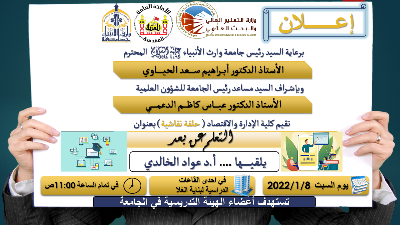 يقيم مركز التعليم المستمر في جامعة وارث الانبياء (عليه السلام) بالتعاون مع كلية الادارة والاقتصاد حلقة نقاشية بعنوان "التعلم عن بعد"، يلقيها ... أ.د عواد كاظم شعلان الخالدي يوم السبت الموافق 1/8/ 2022. وتقام حضورياً على احدى القاعات الدراسية في بناية العُلا وفي تمام الساعة 11:00 صباحاً.لاعضاء الهيئات التدريسية في كليات الجامعة