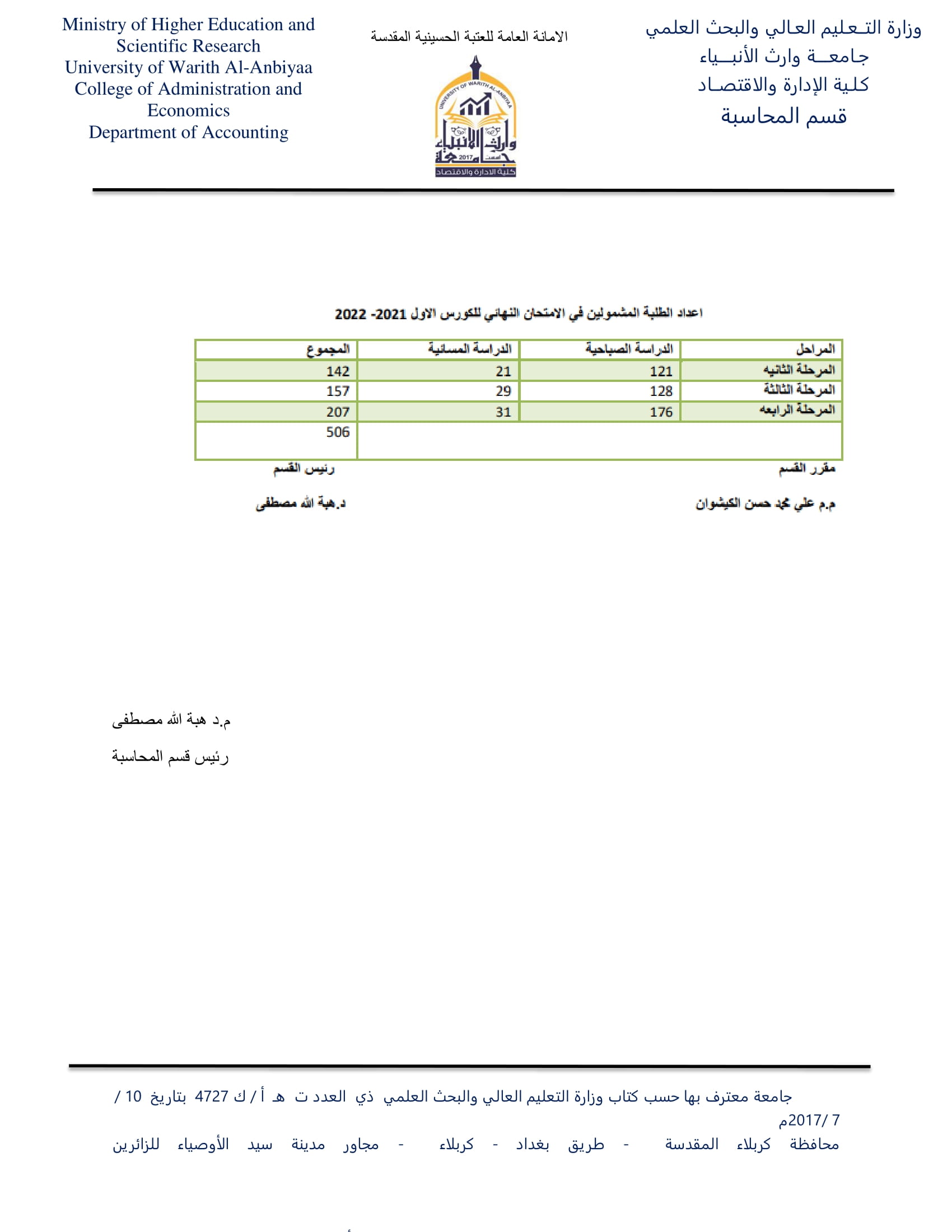 بحضور كل من السيد رئيس الجامعة أ.د ابراهيم المحياوي والاستاذ الدكتور نوفل الاعرجي المساعد الاداري لرئيس الجامعة والسادة العمداء الاستاذ الدكتور عواد الخالدي عميد كلية الادارة والاقتصاد والاستاذ المساعد الدكتور علي الشريفي عميد كلية القانون والسيد المعاون العلمي لكليه الادارة والاقتصاد د.فهد الشمري والسيدة رئيسه قسم المحاسبة الدكتورة هبة الله والسيد مقرر قسم المحاسبة م.علي محمد الكيشوان والسادة التدريسين اقامت كلية الادارة والاقتصاد جامعة وارث الأنبياء حفل ترحيب للطلبة الجدد لقسم المحاسبة للعام الدراسي ٢٠٢١-٢٠٢٢ متمنين لهم دوام الصحة والعافية