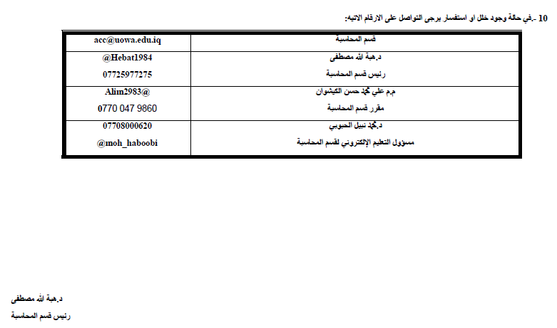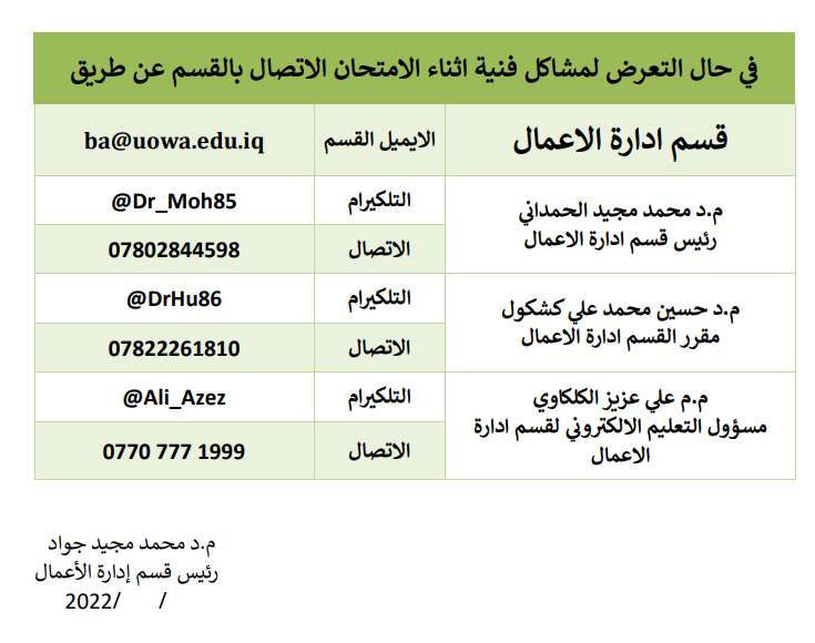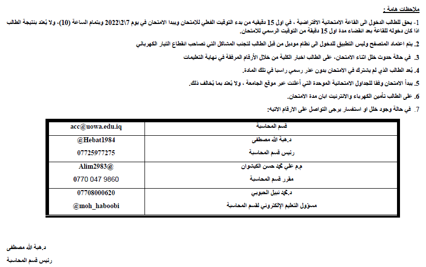1. يبدأ الامتحان الالكتروني عند الساعة (10:00 صباحا) وينتهي الامتحان بشكل تلقائي عند الساعة (12:00 ظهرا) او كما مثبت في اعدادات الامتحان، علما بانه يوجد عداد وقت تنازلي يظهر امام الطالب طيلة فترة الامتحان.2. على جميع الطلبة استخدام صورهم الشخصية الرسمية (كما في المعاملات) ولا تحتسب اجابة الطالب ما لم يغير صورته الشخصية في الايميل الرسمي.3. يجب على الطالب التحقق ارتداء الزي الرسمي والدخول الى غرفة البث المباشر قبل بدء الامتحان بـ 20 دقيقة وتهيئة الهوية الجامعية وقد يطلب منك المراقب فتح الكاميرا وإبراز الهوية الجامعية.4. يحق للطالب الدخول الى القاعة الامتحانية الافتراضية، في اول 15 دقيقة من بدء التوقيت الفعلي للامتحان، ولا يعتد بنتيجة الطالب إذا كان دخوله للقاعة بعد انقضاء مدة 30 دقيقة من التوقيت الرسمي للامتحان.5. يتم اعتماد المتصفح وليس التطبيق للدخول الى نظام موودل، لكون التطبيق قد تم إيقافه بالكامل تجنبا للمشاكل التي تصاحب انقطاع التيار الكهربائي.6. يسمح للطالب بأداء الامتحان لمرة واحدة فقط، وفي حال انقطاع الانترنت فيمكن للطالب العودة الى الامتحان بمجرد إعادة تسجيل الدخول من جديد طالما ان وقت الامتحان لم ينتهي والاجابة لم تسلم بعد.7. التأكد من الإجابة قبل الانتقال إلى السؤال اللاحق لكون الأسئلة باتجاه واحد وفق متطلبات نزاهة الامتحانات الالكترونية.8. يعد الطالب الذي لم يشترك في الامتحان بدون عذر رسمي راسبا في تلك المادة.9. عندما يطلب من الطالب فتح الكاميرا فيجب عليه فتح الكاميرا مباشرة واي نوع من الامتناع او التلكؤ تعد محاولة غش من الطالب اثناء الامتحان.10. إذا ثبت غش الطالب سيتم اعتباره راسبا للعام الدراسي 2021-2022 استنادا الى المادة 22 من التعليمات الامتحانية النافذة.11. من أجل تجنب قطع الامتحان في حالة استخدام جهاز الموبايل بسبب ورود اتصال مكالمات او رسائل واردة للجهاز، ينبغي تفعيل وضع الطيران ثم تشغيل Wi-Fi، وفي حالة استخدام شبكة السيم كارت يجب حجب (بلوك) جميع جهات الاتصال تجنبا لمنع انقطاع الامتحان.12. في حال التعرض لمشاكل فنية اثناء الامتحان الاتصال بالكلية عن طريق الايميل الساخن ([email protected]) او رقم الموبايل الخاص باللجنة الامتحانية 07725977275.