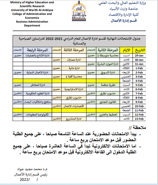 عقد مجلس قسم أدارة الاعمال أجتماعه الرابع لهذا العام الدراسي 2021-2022 في يوم السبت الموافق 22-1-2022 برئاسة السيد رئيس القسم الدكتور محمد مجيد الحمداني وحضور اعضاء الهئية التدريسية الافاضل ، اذ ناقش المجلس استعدادات القسم لاجراء الامتحانات النهائية لكورس الاول وتهيئة القاعات الامتحانية وتوفير الاجواء الصحية الامنة للطلبة الاعزاء وكذلك ناقش المجلس جدول الامتحانات النهائية والقرارات الصادرة من الرئاسة والعمادة الكلية بخصوص الامتحانات الحضورية والالكترونية للعام الدراسي الحالي.ومن الله التوفيق