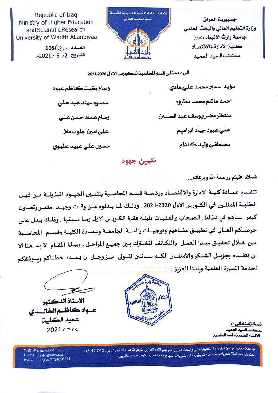 تتقدم كلية الادارة والاقتصاد عمادة ورئاسة قسم المحاسبة بالشكر والتقدير للجهود المبذولة من قبل كل من :د. محمد الحبوبي (مسؤول التعليم الالكتروني ) ؛ والدكتور محمد مجيد (مقرر قسم المحاسبة )على جهودكم المبذولة لاتمام وانجاح الامتحانات الالكترونيه؛ وكذلك الشكر موصول الى كل الاساتذة الذين بذلوا الجهد وتحملو عناء المراقبات الإلكترونيه من قسمي المحاسبة وادارة الاعمال .