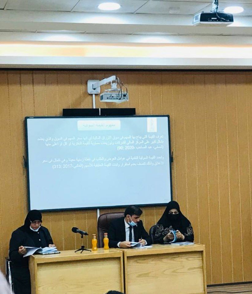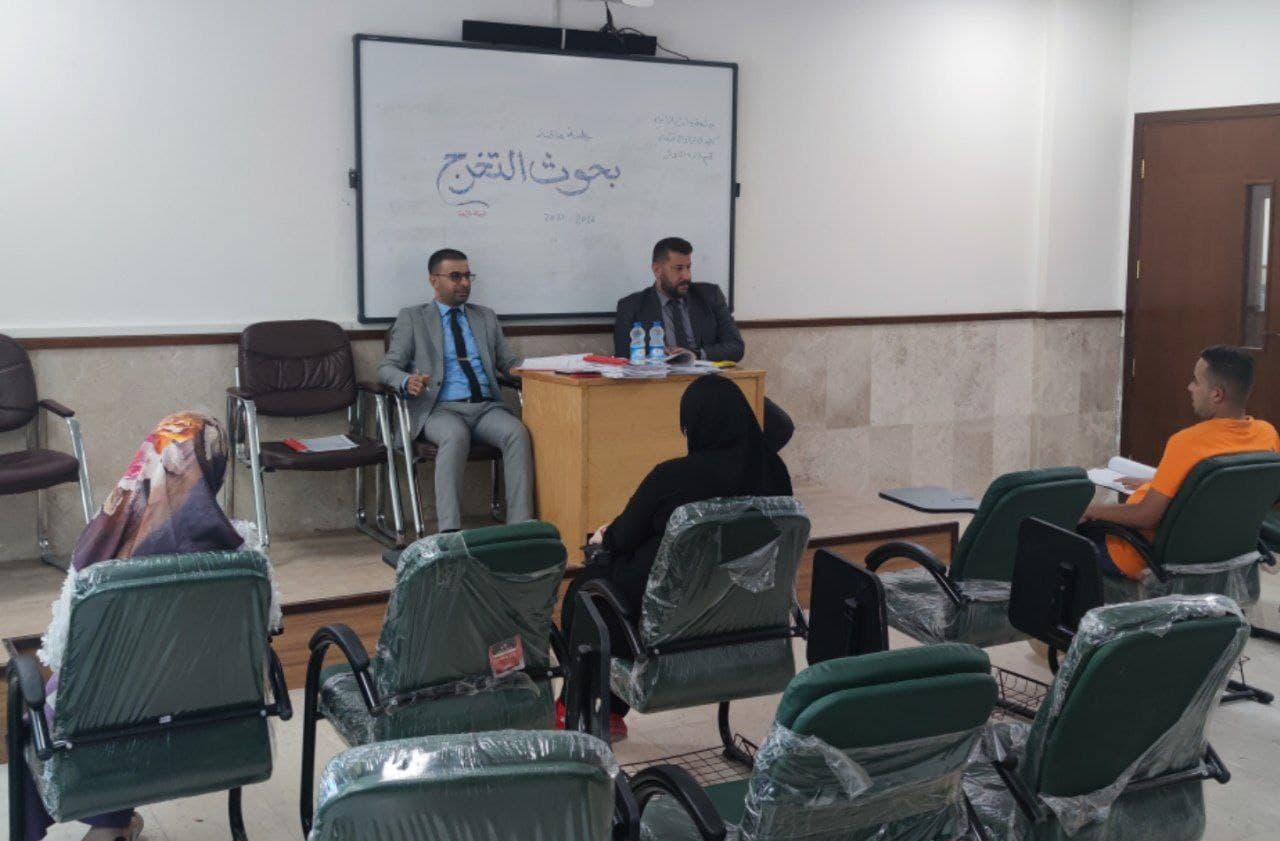 بأشراف السيد عميد كلية الادارة والاقتصاد الاستاذ الدكتور عواد الخالدي وم.د فهد مغيمش الشمري رئيس قسم ادارة الاعمال وم.د هبة الله مصطفى السيد علي رئيس قسم المحاسبة، جرت مناقشة طلبة المرحلة الرابعة لكلية الادارة والاقتصاد ولقسميها العلميين (المحاسبة - ادارة الاعمال) وللدراسيتين الصباحي والمسائي ابتداءً من يوم الثلاثاء المصادف 29/6/2021