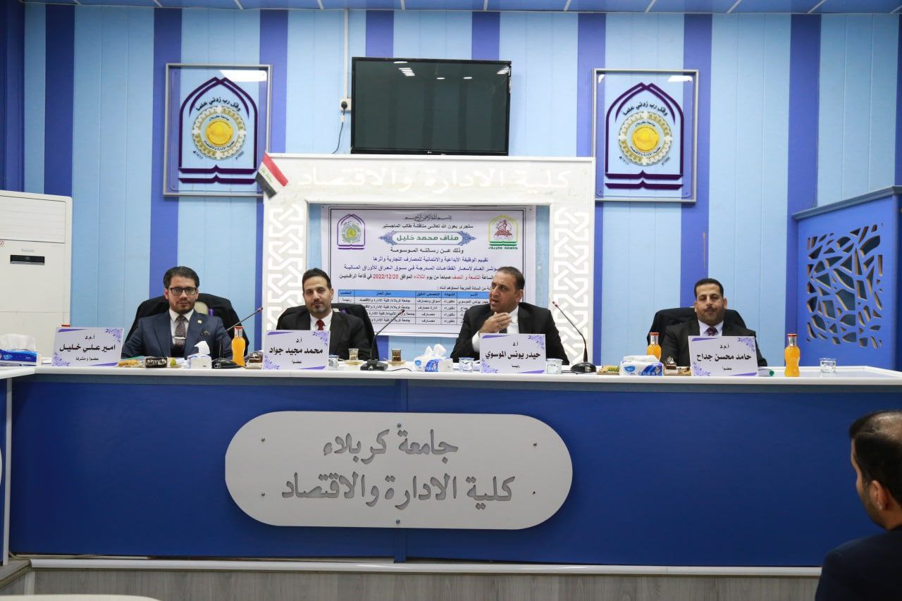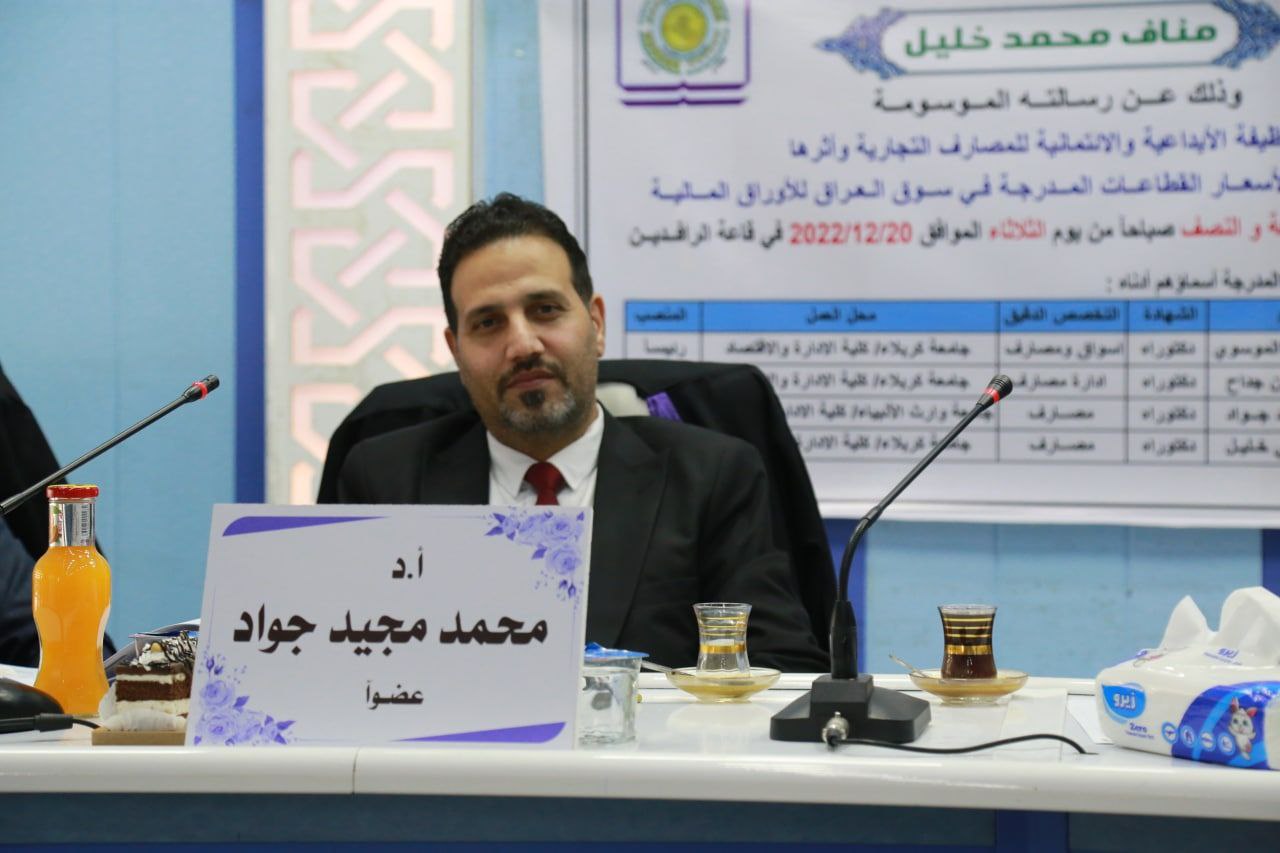 شارك الدكتور محمد مجيد الحمداني في عضويه مناقشة رسالة الماجستير للطالب محمد مناف خليل لرسالته الموسومة ( تقييم الوظيفة الايداعية والائتمانية للمصارف التجارية وأثرها في المؤشرالعام لأسعار القطاعات المدرجة في سوق العراق للأوراق المالية ) وذلك في يوم الثلاثاء المصادف 20/12/2022 في جامعة كربلاء كلية الإدارة والاقتصاد قسم العلوم المالية والمصرفية .