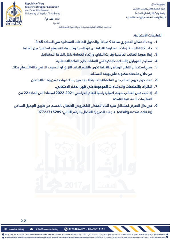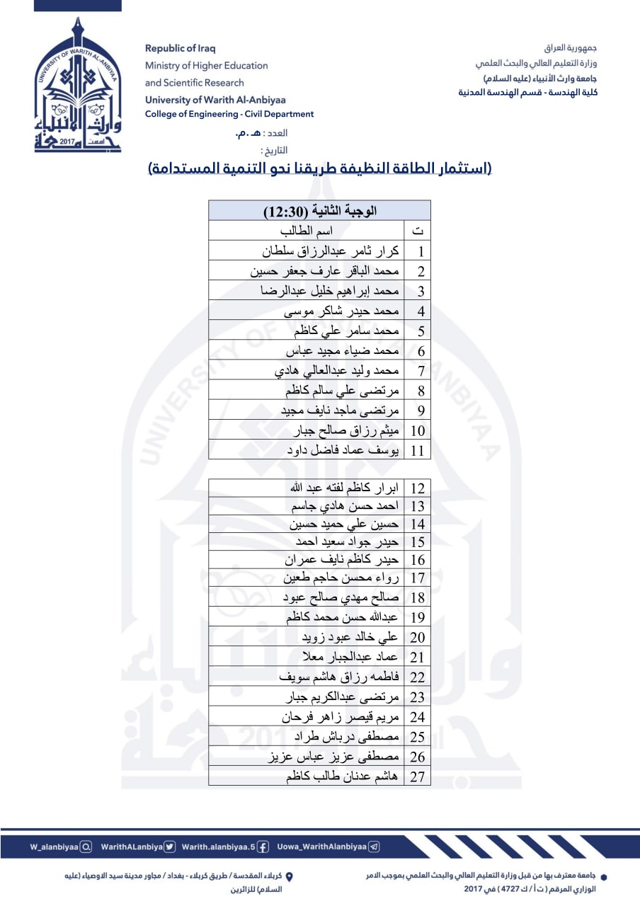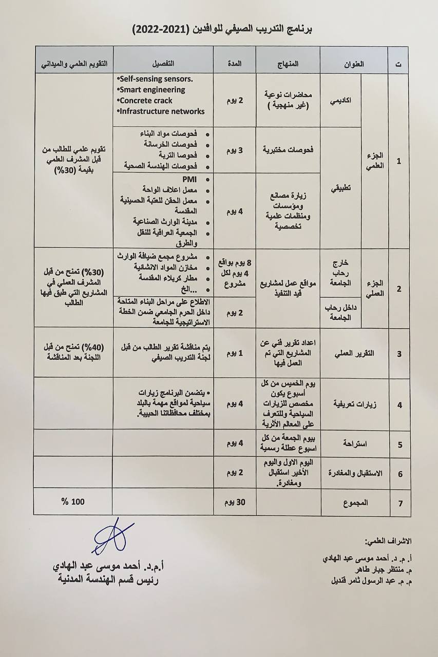 برنامَج التدريب الصيفي للطلبة الوافدين إلى قسم الهندسة المدنية - كلية الهندسة - جامعة وارث الأنبياء للعام الدراسي 2021 - 2022.