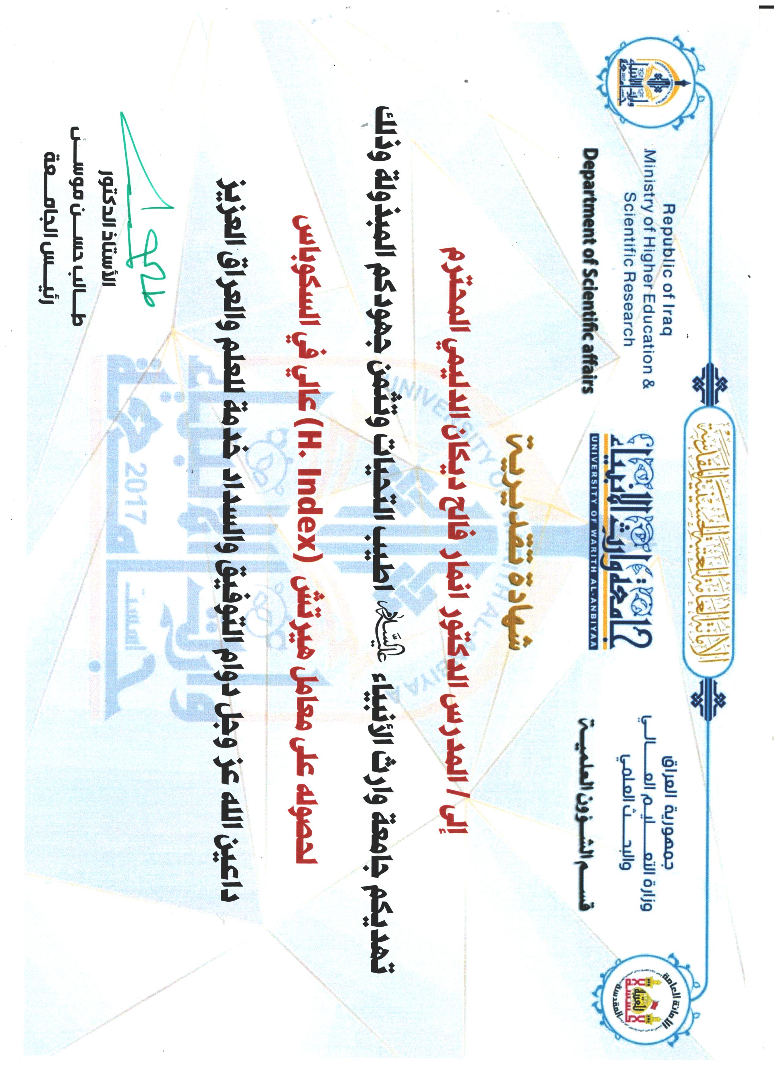 تتقدم جامعة وارث الأنبياء (ع) بالشكر و التقدير إلى م.د. محمد حمزة موسى التدريسي في قسم الهندسة المدنية لجهوده المبذولة في المساهمة بإعلاء الصرح العلمي للجامعة و ذلك لنشر بحثه الموسوم (Fire Resistance of High - Volume Fly Ash RC Slab Inclusion wuth Nano-Silica) في مجلة Materials ضمن قاعدة بيانات Scopus.