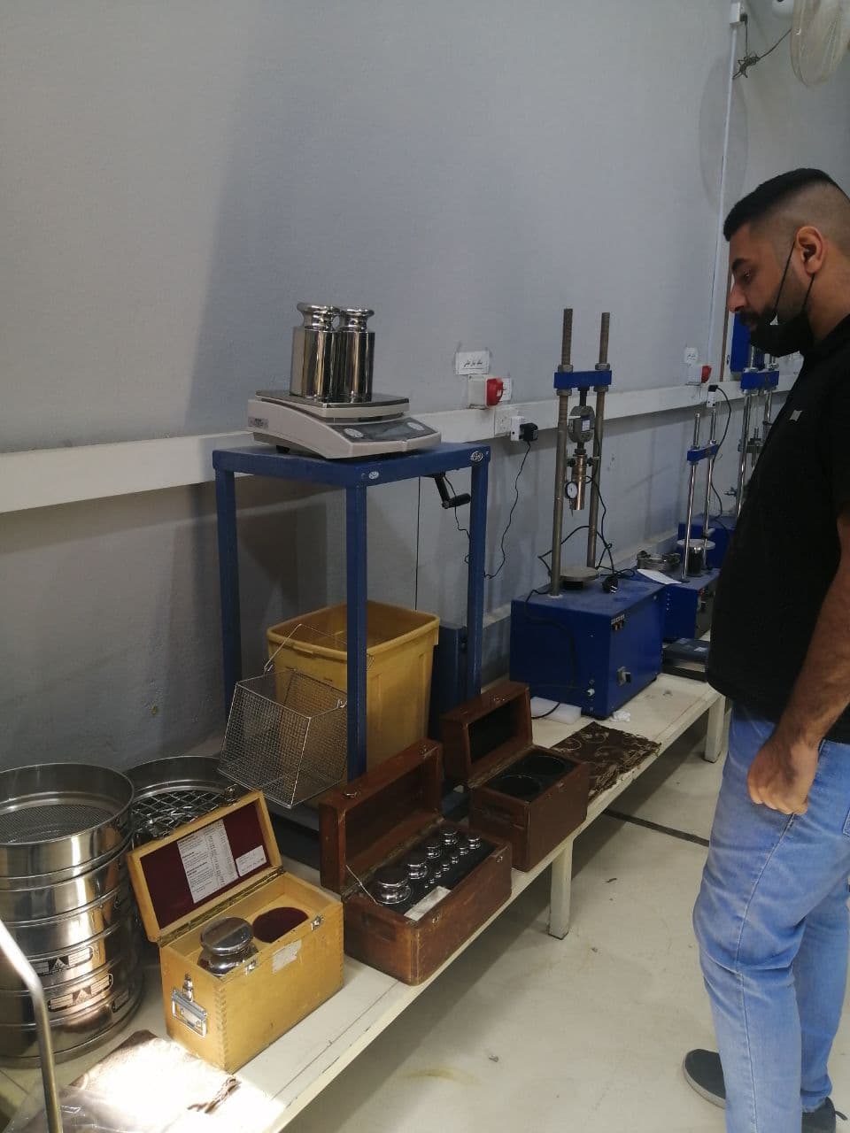 جانب من الجزء العملي من البحث العلمي للتدريسي م.م مصطفى نعيم في مختبرات قسم الهندسة المدنية و الذي يدرس فيه تحسين خصائص التربة إضافة إلى أثر هذه التحسينات على تطبيقات الهندسة المدنية.
