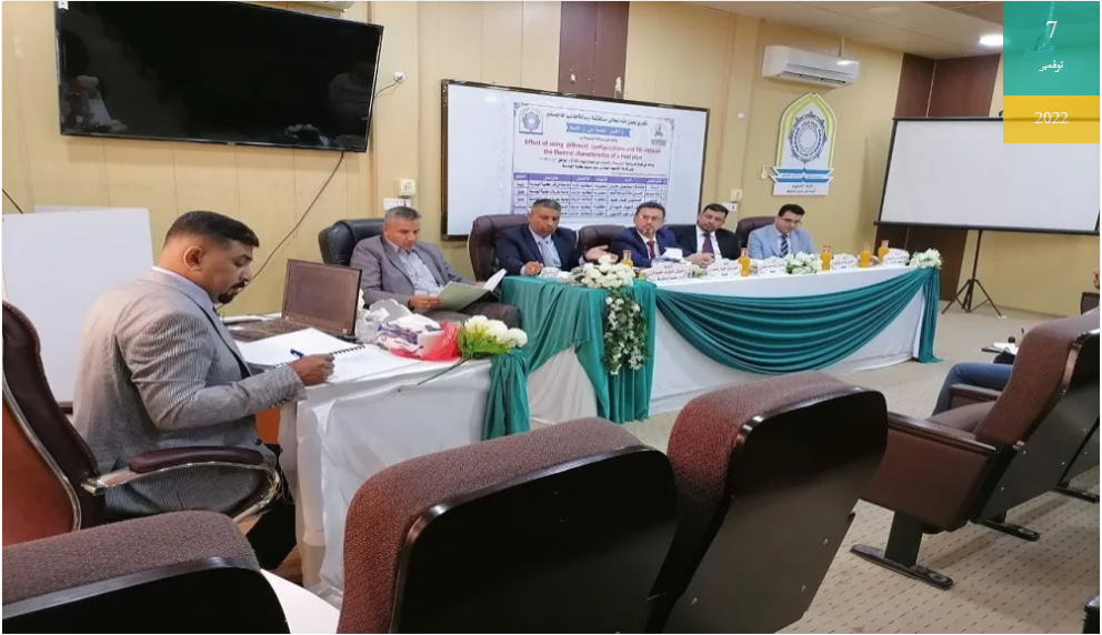 شارك الاستاذ المساعد الدكتور حسن طالب هاشم في مناقشة رسالة ماجستير لباحث من جامعة كربلاء والموسومة (تأثير استخدام التكوينات المختلفة ونسب التعبئة على الخصائص الحرارية لأنبوب الحرارة) هدفت الرسالة الى بناء منصة اختبار للأنابيب الحرارية, التحقيق التجريبي في تأثير ظروف التشغيل ومعلمات التصميم على أداء الأنبوب الحراري المقترح وإجراء تحليل القياسات التجريبية للحصول على المعلمات التي تصف الأداء الحراري للأنبوب الحراري.