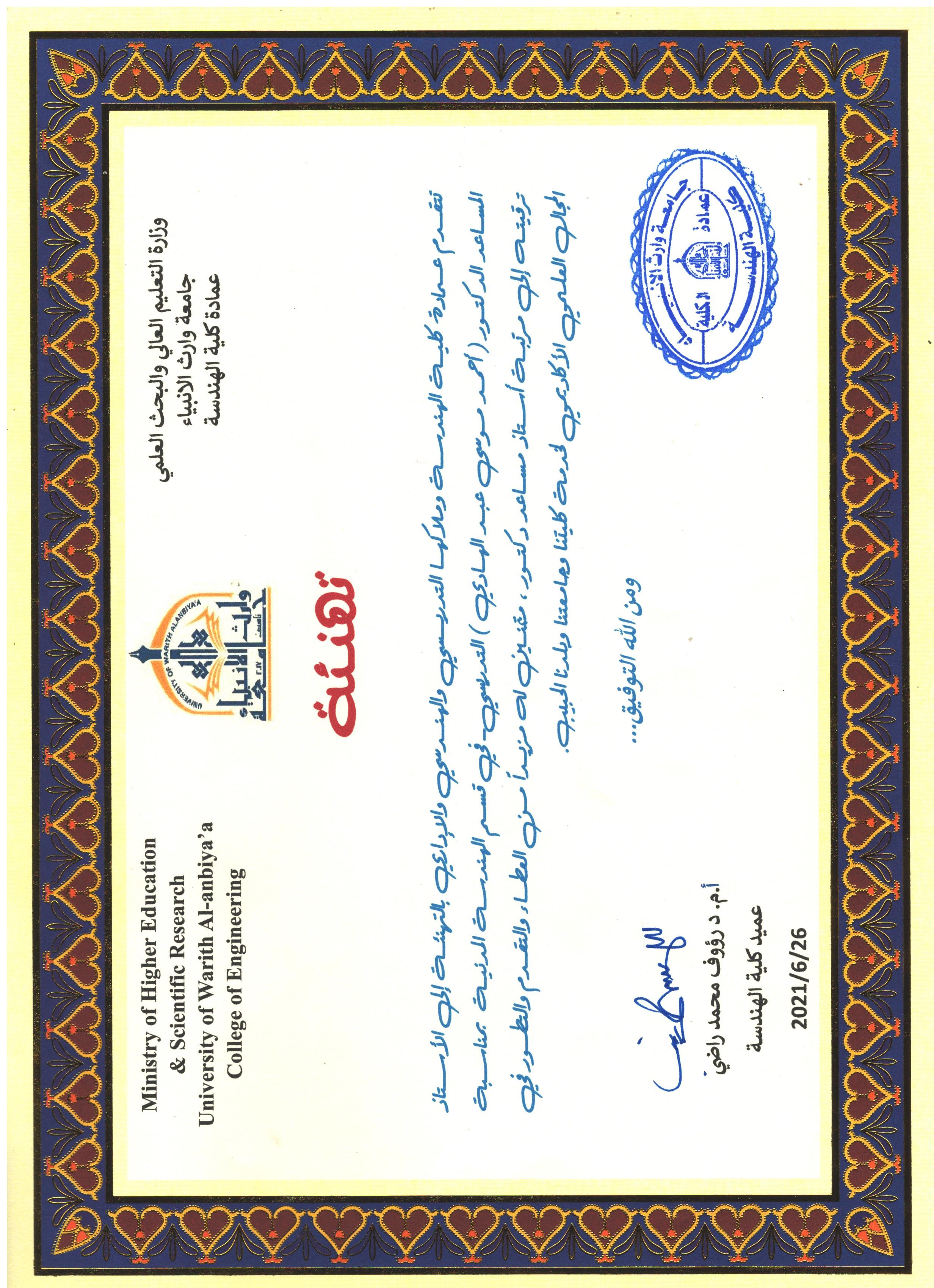 تتقدم كُلْيَة الهندسة و ملاكها التدريسي و الهندسي و الإداري بالتهنئة إلى الأستاذ المساعد الدكتور (أحمد موسى عبدالهادي) التدريسي - في قسم الهندسة المدنية بمناسبة ترقيته إلى مرتبة أستاذ مساعد دكتور، متمنين له مزيداً من العطاء و التقدم و التطور في المجال العلمي الأكاديمي لخدمة كليتنا و جامعتنا و بلدنا الحبيب.