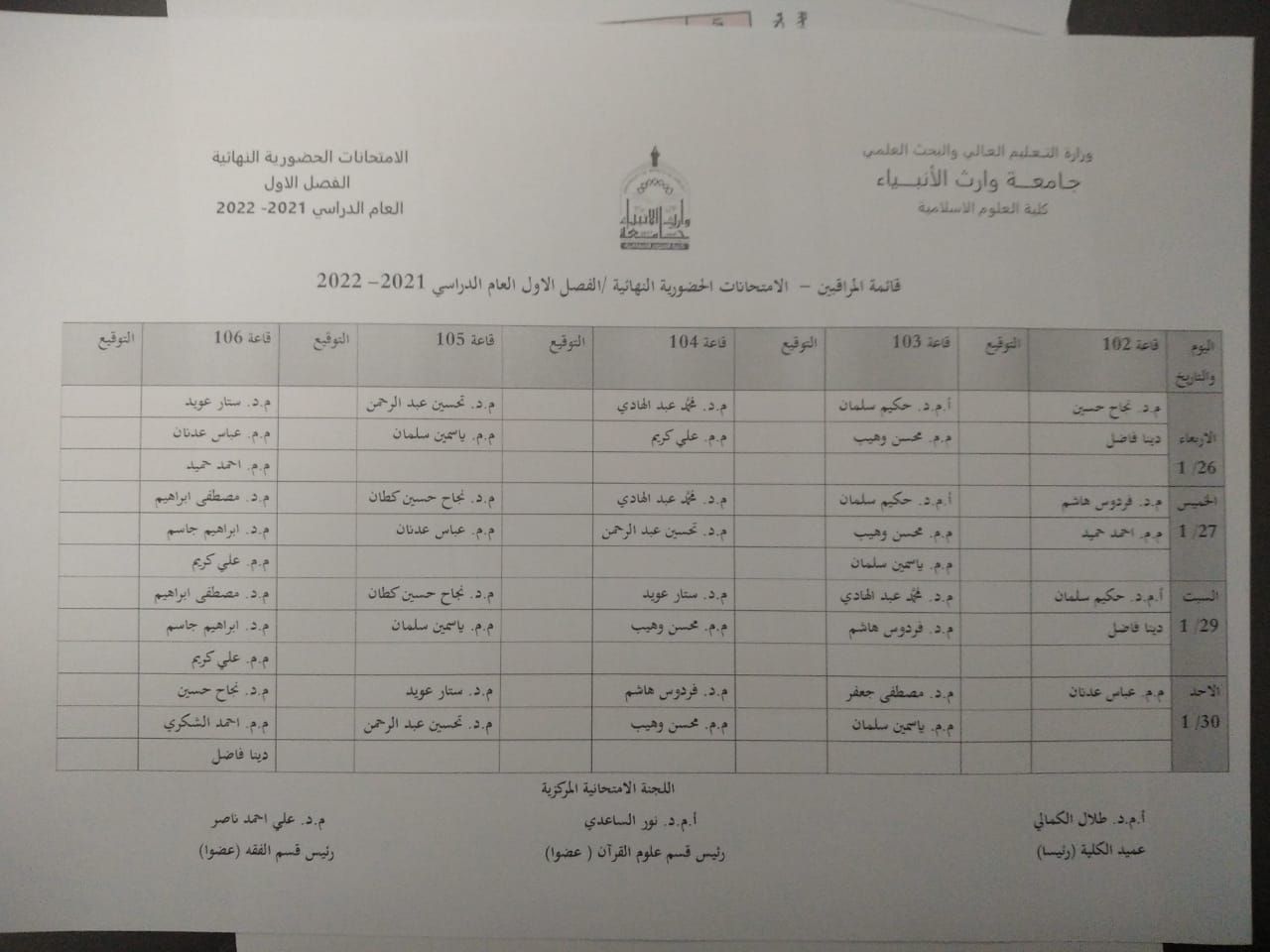 باشرت كلية العلوم الإسلامية في جامعة وارث الأنبياء اليوم الاربعاء الموافق 26/1/2022 الامتحانات النهائية للفصل الدراسي الاول للعام الدراسي 2021 -2022 .