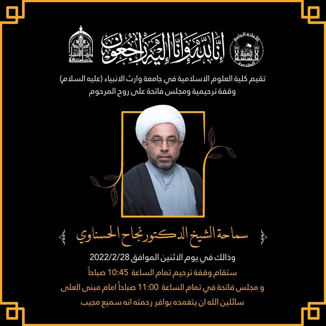 تنعى عمادة كلية العلوم الإسلامية وكوادرها التدريسية والإدارية رحيل المغفور له بإذن الله تعالى سماحة الشيخ الدكتور نجاح الحسناوي تغمده الله بواسع رحمته واسكنه فسيح جناته وقرب بينه وبين محمد واله الطيبين الطاهرين عليهم السلام ...وبهذا المصاب الأليم نتقدم لذوي الفقيد وللاسرة العلمية ولطلبته واحبته باحر ايات العزاء سائلين المولى العزيز أن يرحمه ويرزقه شفاعة محمد واله الطاهرين
