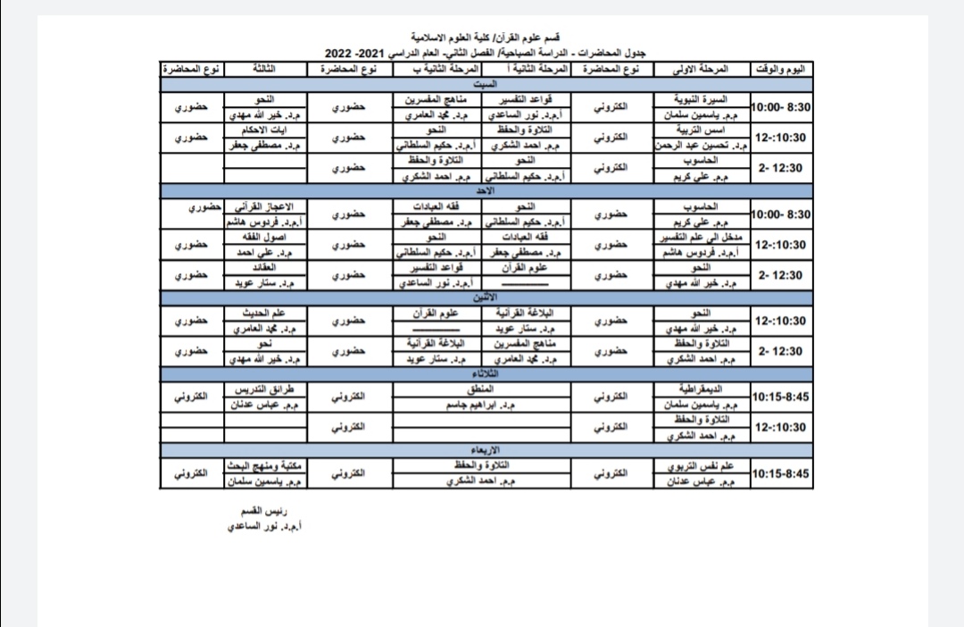 جدول الدروس الدراسة المسائية / قسم علوم القرآن