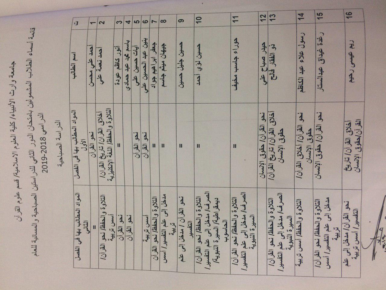جدول امتحانات الدور الثاني للعام الدراسي 2018-2019 لقسمي (الفقه واصوله, علوم القران)علماً ان ابتداء الامتحان سيكون في 2-9-2019