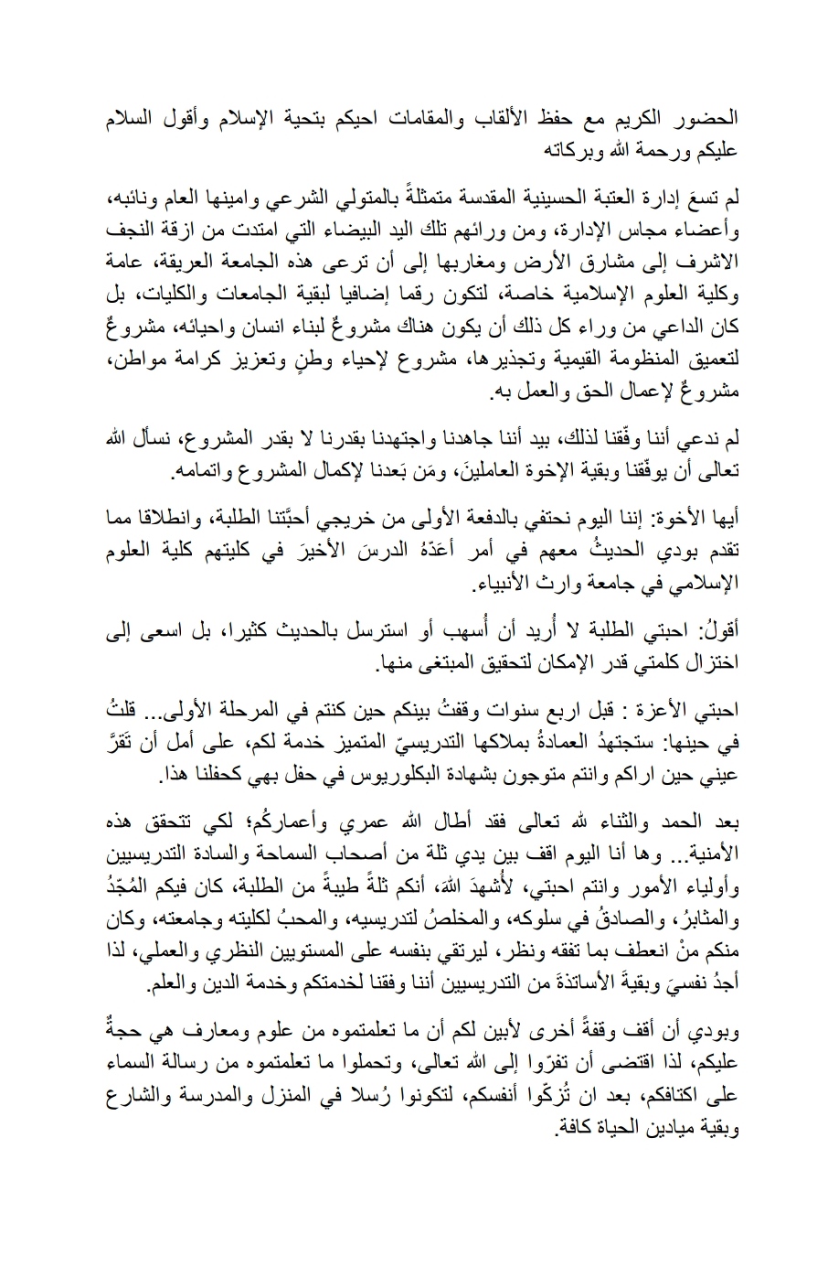 وجه السيد عميد كلية العلوم الإسلامية أ.م.د طلال فائق الكمالي المحترم كلمة خلال حفل تخرج الدفعة الأولى لطلبة الكلية والتي كانت تحمل شعار بالعلم تبنى الاوطان.
