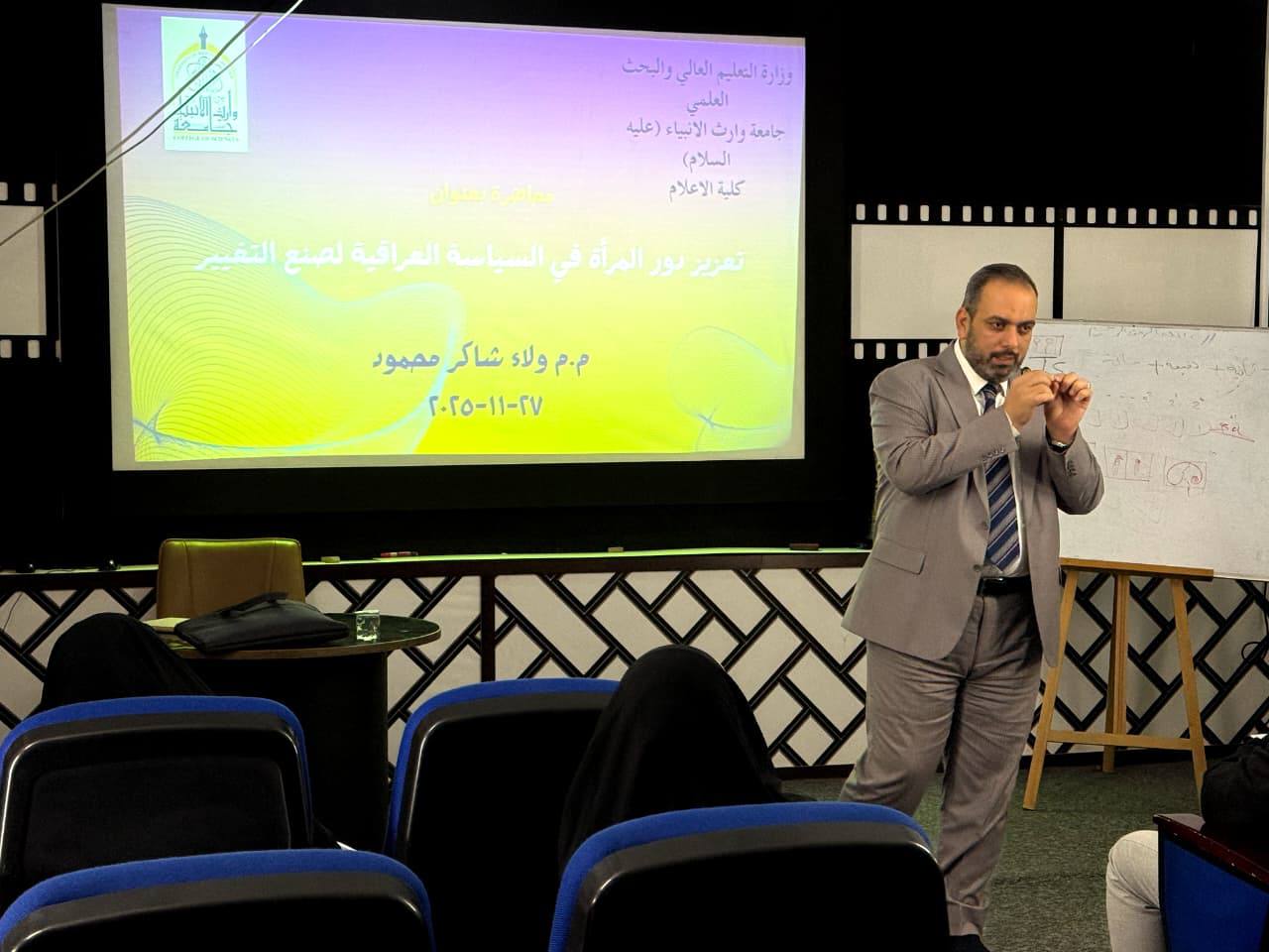 رعاية السيد رئيس جامعة وارث الأنبياء أ.د ابراهيم سعيد الحياوي وباشرف السيد عميد كلية الاعلام (أ.م.د محمد جمال الطيف) أقامت شعبة شؤون المرأة في جامعة وارث الأنبياء(عليه السلام) وبالتعاون مع كلية الإعلام ندوه بعنوان (توظيف الإعلام في الحد من ظواهر العنف والتحرش والابتزاز) قدمها التدريسي في قسم الإعلام الرقمي (م. د أمجد علي عبد الكاظم) يوم الاثنين الموافق (2025/11/22) بمقر الجامعة بحضور اساتذة وطلبة كلية الاعلام.