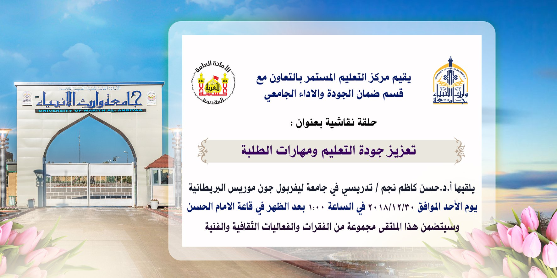 احتضنت جامعة وارث الانبياء وعلى قاعاتها وبرعاية مباركة من العتبة الحسينية المقدسة وبالاشتراك مع مؤسسة وارث الانبياء التابعة للعتبة الحسينية المقدسة الملتقى الفصلي الخامس تحت شعار(افاق النهضة الحسينية) وبعنوان سبل ترسيخ الفكر الحسيني لدى زائر الاربعين حيث ذكر الدكتور طلال فائق الكمالي عميد كلية العلوم الاسلامية أن الملتقى جاء نتيجة ضرورة التلاقح الفكري والمجتمعي بين الاكاديمين وبعض المؤسسات الدينية والاجتماعية فضلا عن الشخصيات التي تكون هناك رعاية خاصة لديها لمثل هكذا نشاطات وأضاف الكمالي ان الاهتمام بهكذا قضايا هو دليل واضح وترسيخ لفكرة قيام الجامعة وارتباطها الوثيق بالنهضة الحسينية وتسخير كافة الرؤى والاليات والأفكار لتنفيذ طموحات الأبحاث في مواضيع النهضة الحسينية.
