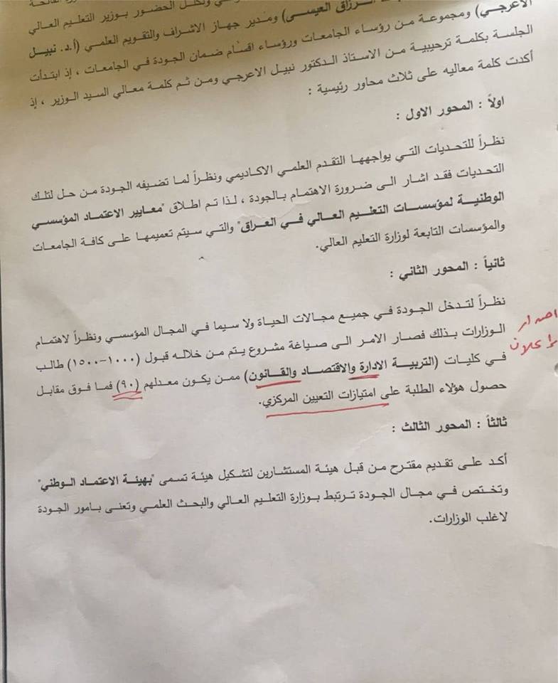 بناءا على مقترح وزارة التعليم العالي والبحث العلمي لخطة قبول الطلبة من ذوي المعدلات (90%) فما فوق فقد قرر مجلس الوزراء اعتماد خطة الموارد البشرية في حقل العلوم الادارية والاقتصادية والمالية والقانونية الواردة في كتاب وزارة التعليم العالي والبحث العلمي ذي العدد: م.و 1/632 والمؤرخ 24/4/2018 وبحسب الاتي: 1.قبول الطلبة من ذوي المعدلات (90%) فما فوق من خريجي الدراسة الاعدادية/الفرع العلمي (تطبيقي, احيائي) في كليات الادارة والاقتصاد ضمن أقسام (ادارة الاعمال , الاحصاء, الادارة العامة, الادارة الصناعية, المحاسبة ,الاقتصاد, العلوم المالية والمصرفية). 2.قبول الطلبة من ذوي المعدلات (90%) فما فوق من خريجي الدراسة الاعدادية الفرعين(العلمي/تطبيقي أحيائي) والادبي في كليات: القانون والتربية الاساسية بأختصاصاتها كافة ضمن خطة (1000) مقعد على وفق تنوع التعليم.وقد جاء القرار على ضوء أهمية تهيئة نخبة من طلبة الدراسية الاعدادية بخطة شمولهم ضمن القبول المركزي وصولا الى بناء أجيال جديدة تحمل لواء العلم والمعرفة في المجتمع العراقي. علما أن صياغة المشروع يتم من خلاله قبول (1000-1500) طالب في كليات (التربية الادارة والاقتصاد والقانون) ممن يكون معدلهم (90) فمافوق مقابل حصول هؤلاء الطلبة على امتيازات التعيين المركزي.