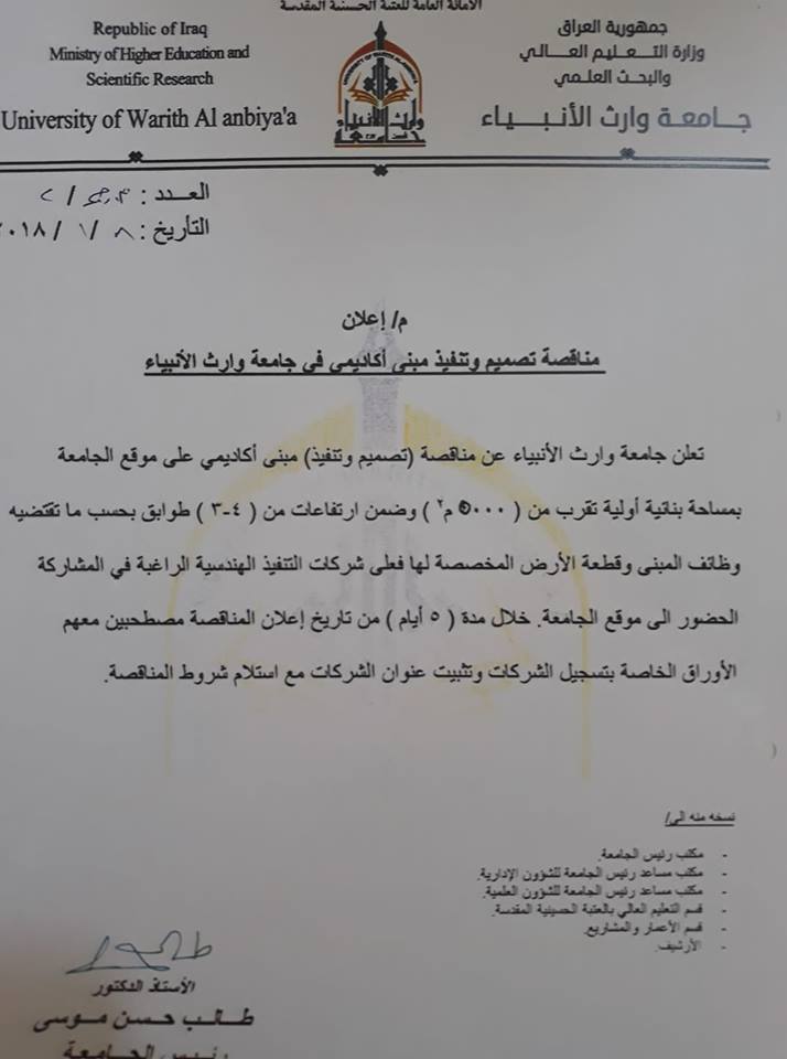 مساهمة من جامعة وارث الانبياء لبناء وتنمية القيادات الحكومية يعلن قسم التعليم المستمر اقامة دورة تدريبية بعنوان (الفساد الاداري التشخيص والعلاجات) لقيادات الدوائر الحكومية والقطاع الخاص والوسائل الاعلامية والقيادات الجامعية يلقيها ا.د.عاصم محمد الاعرجي ولمدة ثلاثة ايام بواقع اربعة ساعات لليوم الواحد وباجور اشتراك ١٥٠٠٠٠ دينار علما :ان فترة التسجيل يبدأ من يوم الثلاثاء الموافق ٢/١/٢٠١٨ ولغاية اسبوع في مقر الجامعة بمليء استمارةالمستمسكات المطلوبة جنسية اوبطاقة وطنية مع صورة عدد ٢صك او مبلغ الاشتراك تأييد من دائرة المشترك