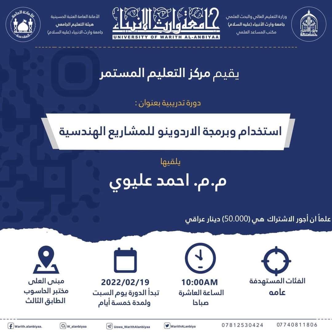 أقام مركز التعليم المستمر في جامعة وارث االأنبياء (عليه السلام) دورة تدريبية بعنوان (استخدام وبرمجة الاردوينو للمشاريع الهندسية) ألقاها المتخصص في مجال هندسة الحاسبات المهندس (م.م. احمد عليوي)الذي تحدث قائلا: "تستمر الدورة لمدة خمسة أيام وتستهدف طلبة كلية الهندسة وكل الراغبين بتطوير مهاراتهم في استخدام وبرمجة الاردوينو للمشاريع الهندسية، إذ يجب على المهندس معرفة أغلب البرامج الهندسية التي تمكنه من اتقان عمله والتميز فيه، وهذا ماتطمح الية الجامعة من إقامة هكذا دورات لتخريج طلبة يتقنون تخصصهم.