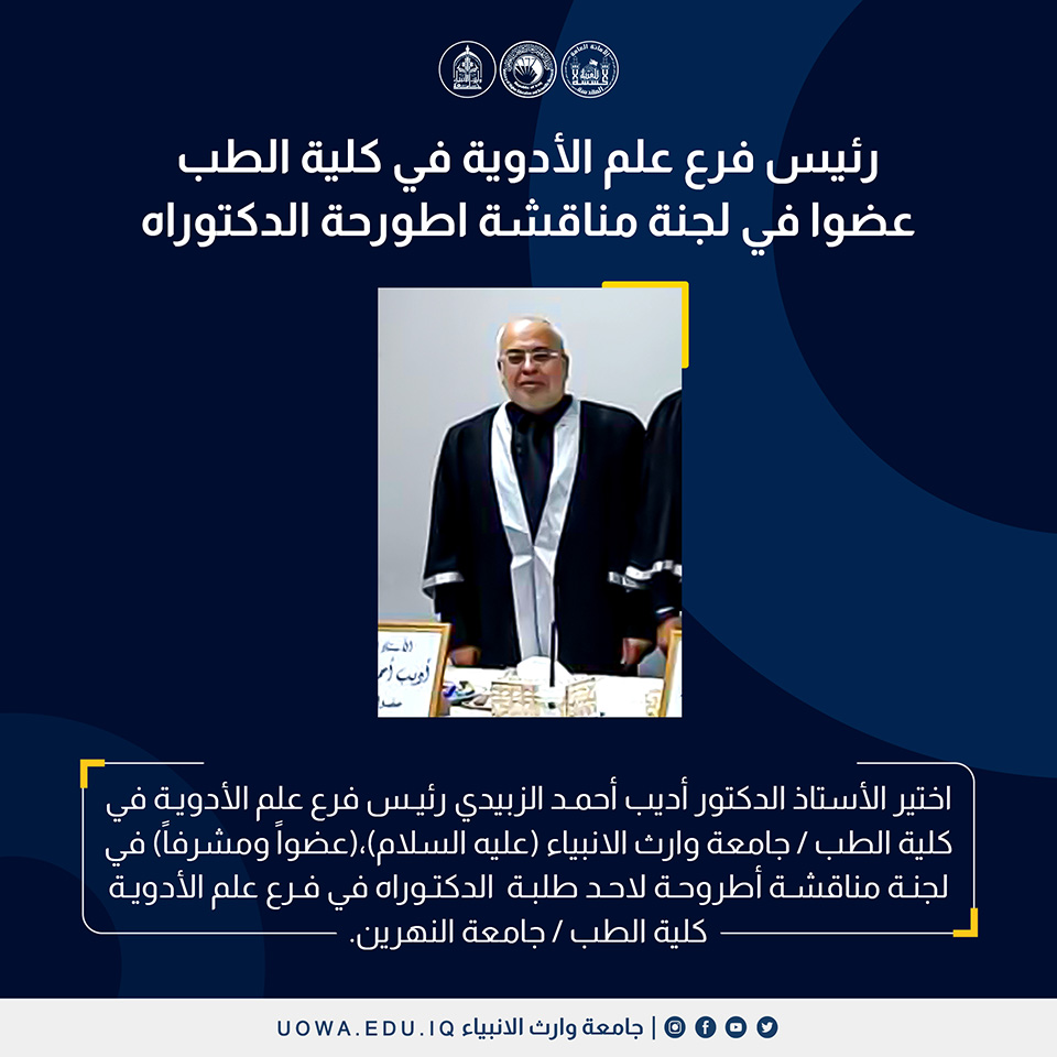 تم اختيار الأستاذ الدكتور أديب أحمد الزبيدي، رئيس فرع علم الأدوية في كلية الطب بجامعة وارث الأنبياء (عليه السلام)، كعضو ومشرف في لجنة مناقشة أطروحة لطالب دكتوراه في فرع علم الأدوية بكلية الطب في جامعة النهرين. يُلاحظ أن هناك تفضيل كبير لأساتذة التدريس والعمداء في جامعة وارث الأنبياء (عليه السلام) ليشغلوا مناصب رئيسية أو عضوية في لجان مناقشة أطروحات دراساتهم العليا بناءً على كفاءتهم العلمية.