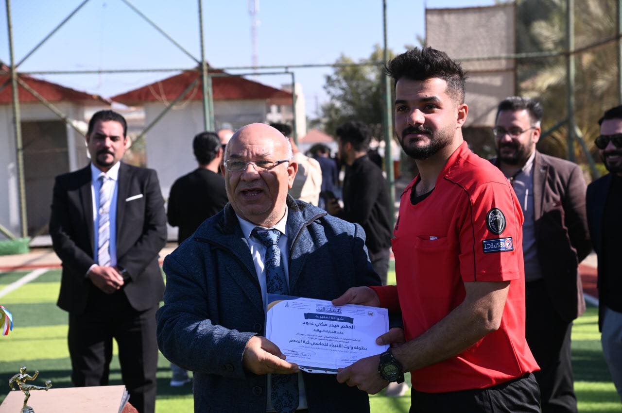 برعاية السيد رئيس الجامعة الأستاذ الدكتور إبراهيم الحياوي ،اختتم قسم النشاطات الطلابية وبالتعاون مع مركز رعاية الشباب في العتبة الحسينية المقدسة، نهائي بطولة وارث الأنبياء لخماسي الكرة.وقال رئيس قسم النشاطات الطلابية الدكتور همام الخفاجي : "ان البطولة كانت حماسية وممتعة ومليئة بالطاقات الشبابية الرياضية والمهارات العالية، نأمل أن يكون لهم مستقبل واعد في كرة القدم"وأشاد الخفاجي بالدور الكبير لمركز رعاية الشباب في إنجاح البطولة. استمرت منافسات البطولة لمدة ما يقارب الشهر، اذ تأهل فيها للمباراة النهائية، فريق قسم هندسة الطب الحياتي وفريق قسم إدارة الأعمال، وانتهت بفوز فريق قسم إدارة الاعمال بنتيجة (7-6).واختتمت المباراة النهائية بتوزيع الجوائز على الفرق الفائزة بالمركز الأول والثاني وجائزة أفضل لاعب وأفضل حارس مرمى وافضل هداف في البطولة.