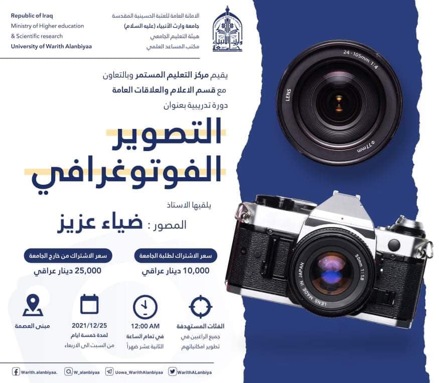 لجميع الراغبين في تطوير امكانياتهم في احترافية التصوير الفوتوغرافي.* يحاضر في الدورة المصور (ضياء عزيز)* مدرب فوتوغرافي معتمد من أكاديمية اوسان للتدريب الاعلامي* عضو هيئة تدريسية في المركز العراقي للدراسات والبحوث الاعلامية* حاصل على 29 جائزة دولية .