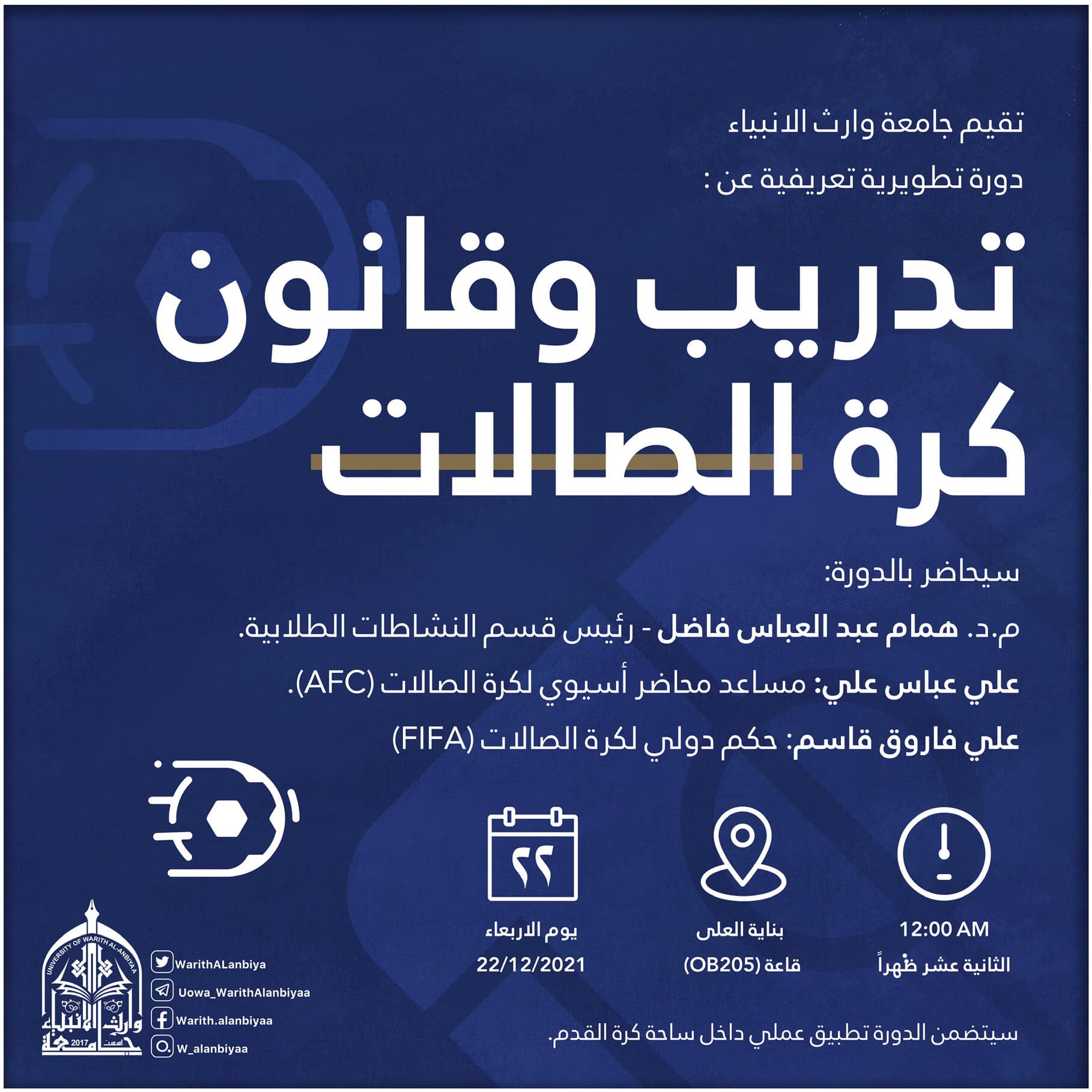 أجرى قسم النشاطات الطلابية في الجامعة وبالتعاون مع مركز رعاية الشباب في العتبة الحسينية المقدسة قرعة بطولة وارث الانبياء(عليه السلام) لخماسي الكرة المزمع إقامتها خلال الايام القادمة.وقال م.د همام عبد العباس رئيس قسم النشاطات الطلابية : جرت القرعة بحضور ممثلين عن الفرق المتنافسة في كليات واقسام الجامعة بواقع22فريقحيث سيكون نظام البطولة هو التسقيط الفردي بين الفرق المشاركة فضلاً عن توزيع جوائز للطلبة اللاعبين المتميزين في كل مبارة ومن ثم أختيارهم ليمثلوا فريق الجامعة في البطولات الجامعية.