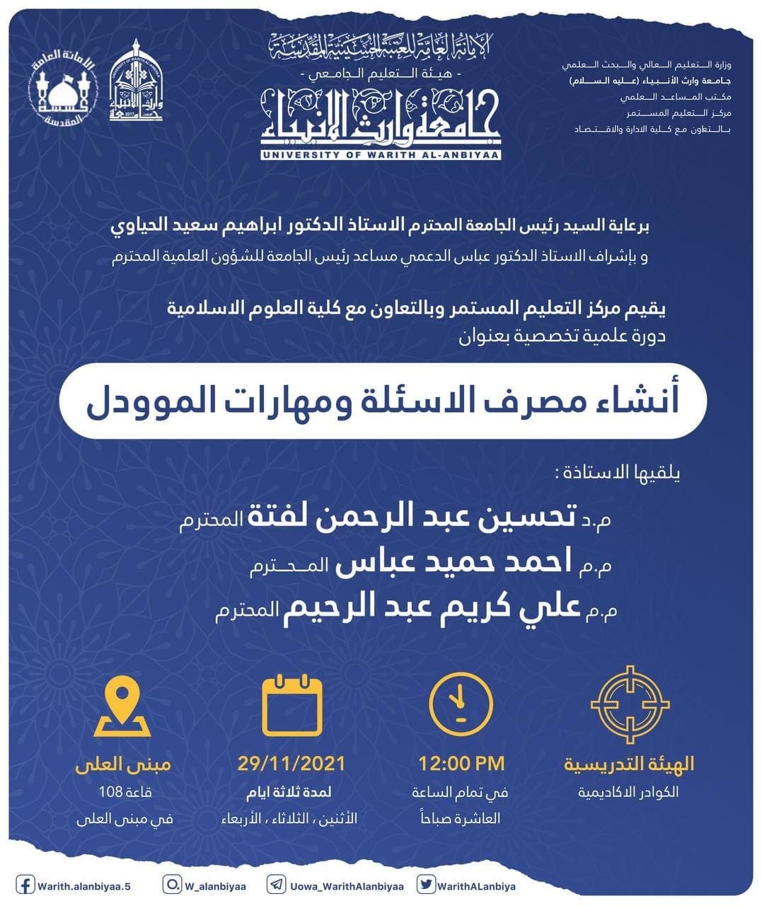 جامعة وارث الانبياء(عليه السلام) تستحصل موافقة وزارة التعليم العالي والبحث العلمي لاستحداث قسم العلوم المالية والمصرفية الإسلامية في كلية العلوم الإسلامية للدراسة الصباحية فقطيقبل القسم خريجي احيائي + تطبيقي + علمي + ادبي + وخريجي مراكز التدريب المهني الذي تكون مدة الدراسة فيها ثلاث سنوات الطلبة الذين ادوا الامتحان الوزاري في الاختصاص المناظر+الاعداديات الاسلامية التابعة للتربية(صباحي ومسائي) +الاعداديات الاسلامية التابعة للوقفين (الدراسة الصباحية طلبة الدراسة الخارجية (من ادو الامتحان التقويمي فقط))+ معهد اعداد معلمين (قسم الدراسة الاسلامية ، قسم اللغة العربية)