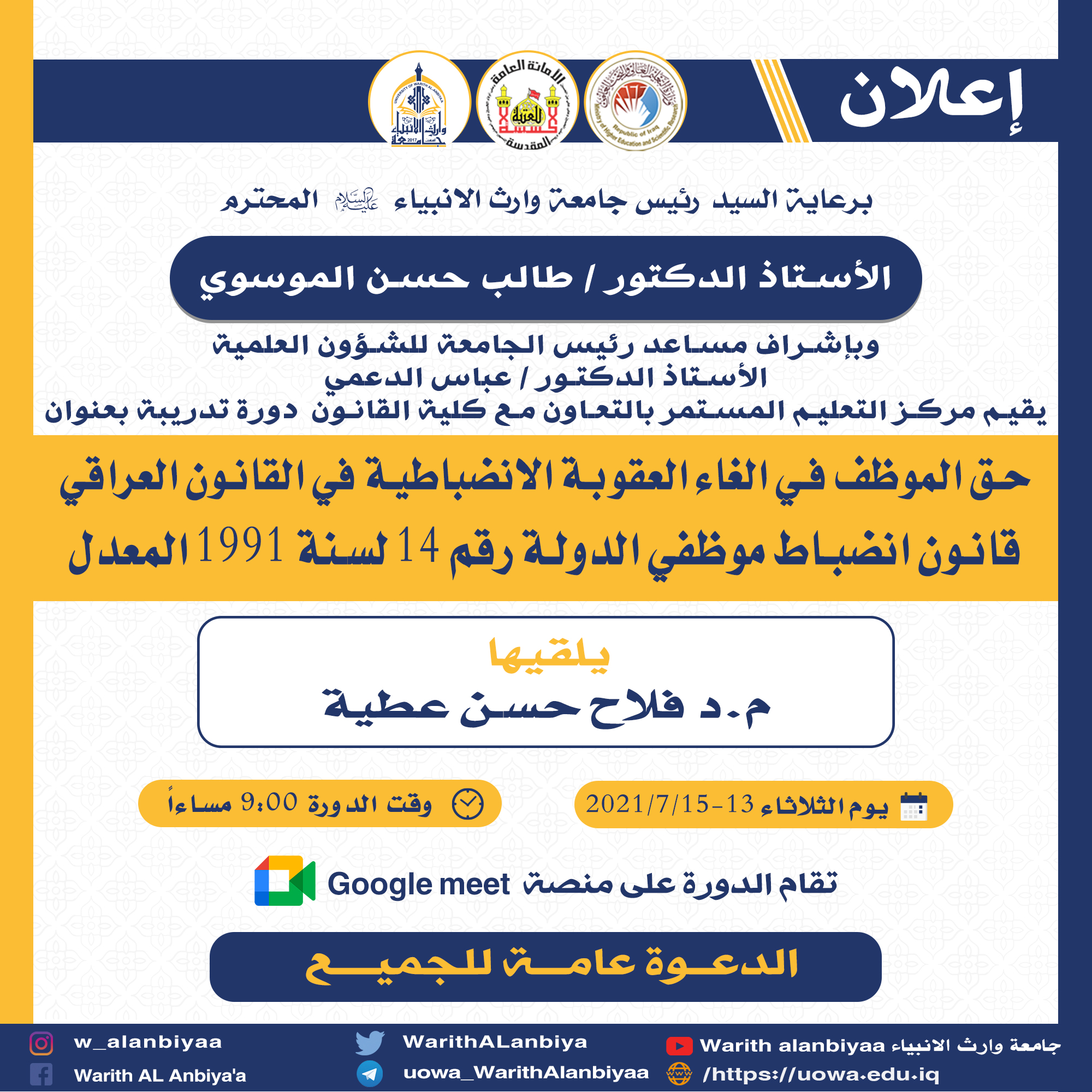 إقامة كلية القانون حلقة نقاشية تحت عنوان (العقوبات الانضباطية في قانون العمل بتاريخ) في يوم الاثنين الموافق 05/07/2021 في تمام الساعة الواحدة ظهراً والّتي تتولّى إقامتها (م.م.غسق خليل ابراهيم ) .