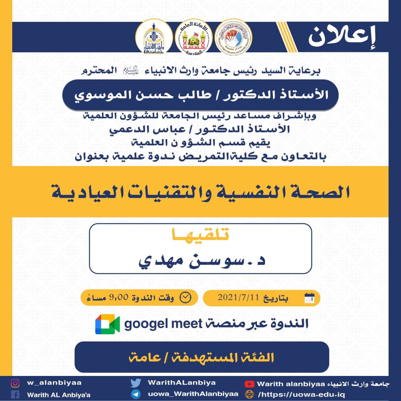 اقام قسم الشؤون العلمية وبالتعاون مع كلية الإدارة والاقتصاد ورشة علمية بعنوان(التعلم المحاسبي في ظل جائحة كورونا) حاضر فيها كل من أ.د بثينه الكعبي عميد كليه الادارة والاقتصاد في الجامعة المستنصرية