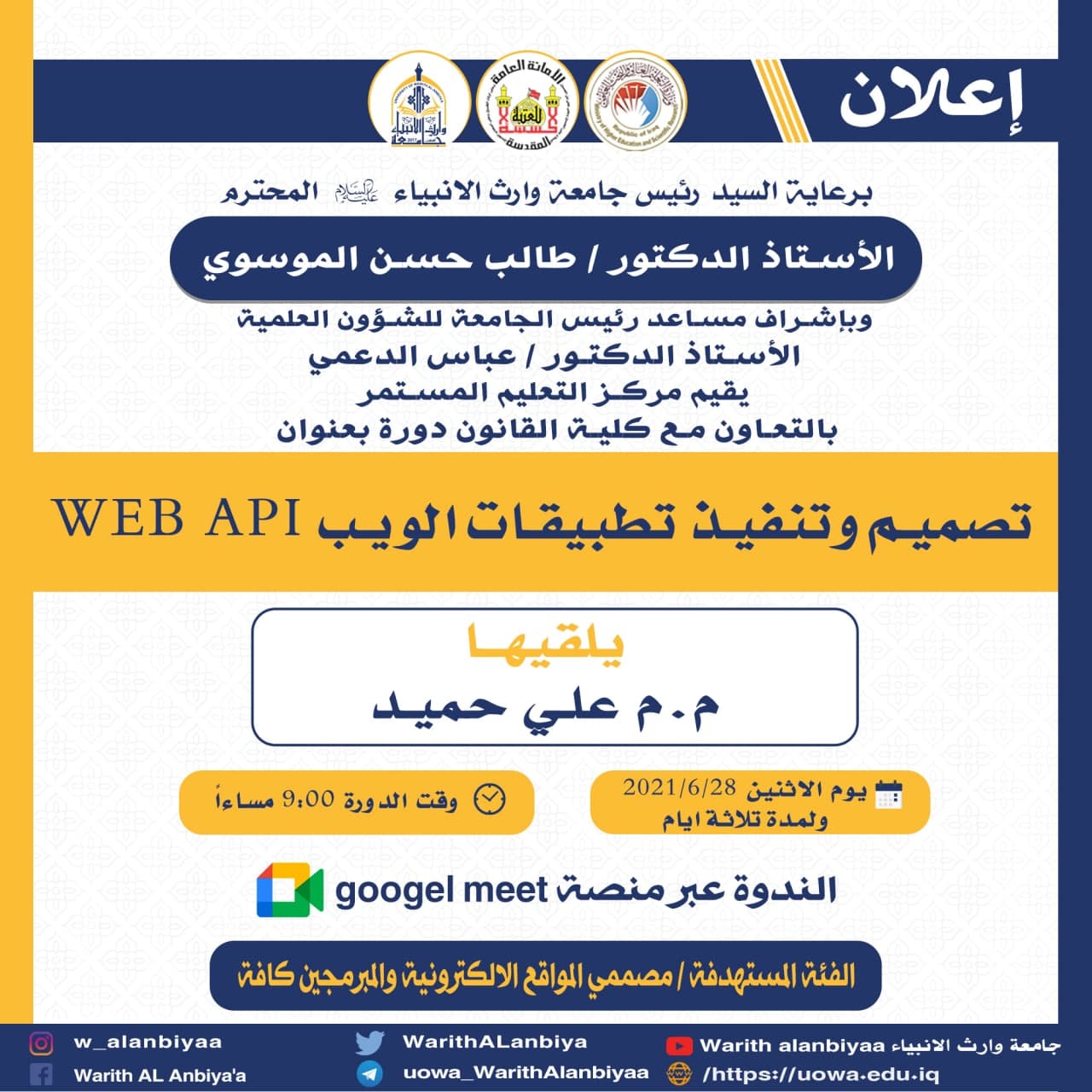 ضمن البرامج التدريبية التي تقيمها جامعة وارث الانبياء (عليه السلام)، يقيم مركز التعليم المستمر دورة تدريبية للمبرمجين والهواة في تصميم المواقع تحت عنوان: (تصميم وتنفيذ تطبيقات الويب Web API) يلقيها التدريسي في كلية القانون :م.م علي حميد / كلية القانون ماجستير- علوم حاسباتوذلك ابتداء من يوم الاثنين الموافق 28/6/2021 ولمدة ثلاث ايامفي تمام الساعة التاسعة مساءا وتلقى الدورة الكترونيا على منصة التعليم الالكتروني التابعة للجامعة -ضمن كورس التعليم المستمر اًو من خلال الضغط على التالي:
