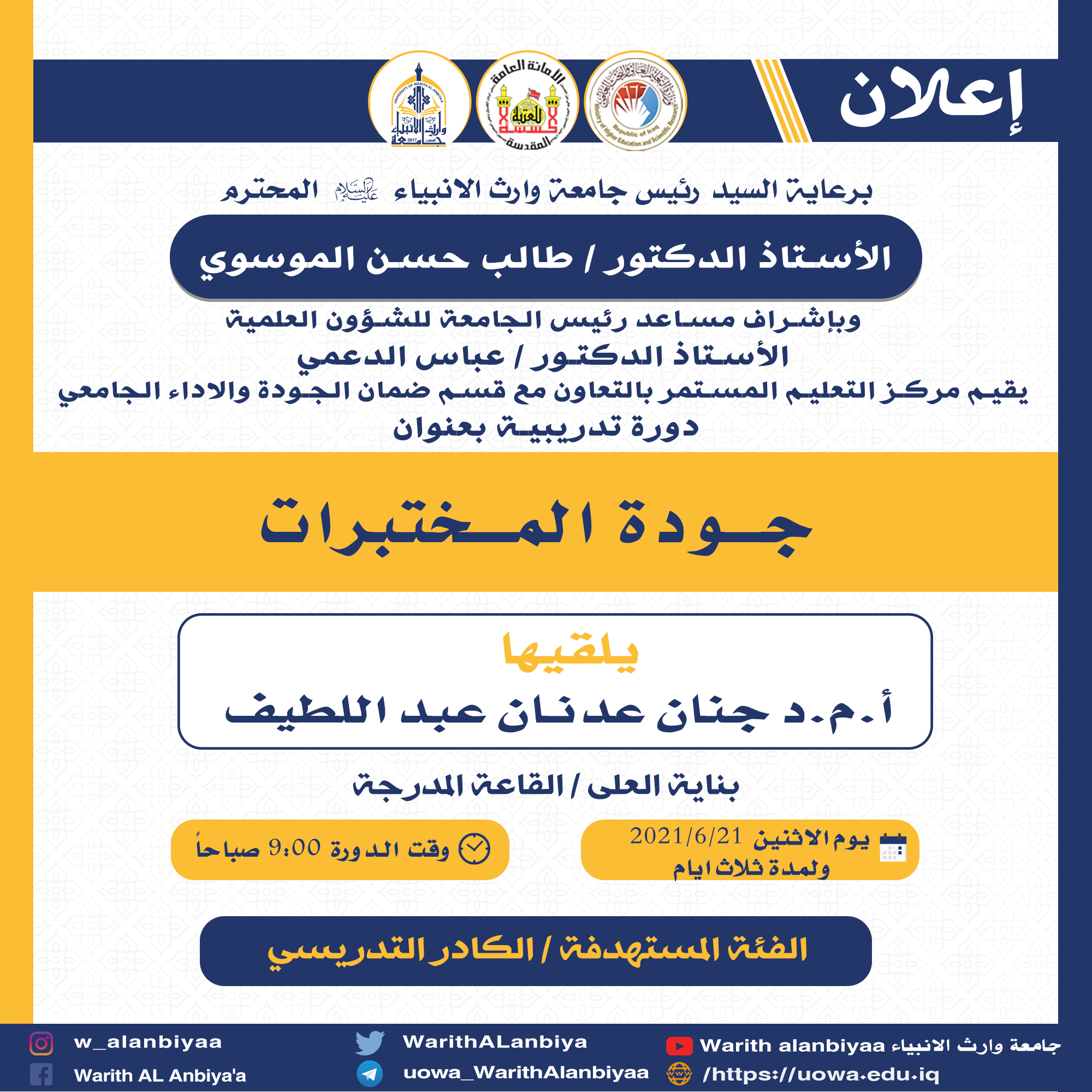 يقيم مركز التعليم المستمر في جامعة وارث الانبياء (عليه السلام)بالتعاون مع قسم ضمان الجودة والاداء الجامعي دورة تدريبية تحت عنوان (جودة المختبرات) والتي تعقد على مدى ثلاثة ايام ابتداءً من يوم الاثنين الموافق (23،22،21\6\2021) في تمام الساعة التاسعة صباحاً في بناية العلى/القاعة المدرجة وستحاضر في الدورة التدريسية (ا.م.دجنان عدنان عبد اللطيف) من جامعة الكرخ للعلوم، تستهدف الدورة الكوادر التدريسية والفنيين في المختبرات.