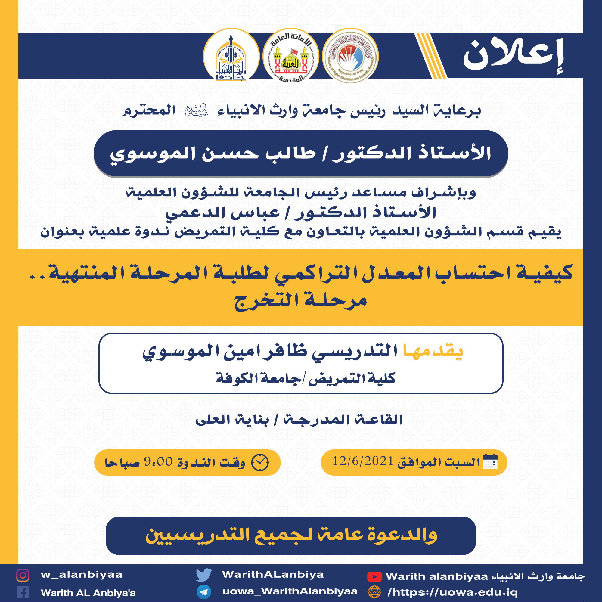 تقيم الشؤون العلمية في كلية العلوم الإسلامية / جامعة وارث الأنبياء ندوة علمية بعنوان ( القواعد القرآنية الحاكمة في العلاقات الإنسانية) يحاضر فيها الدكتور ( مصطفى جعفر الإبراهيمي) ومدير الجلسة الدكتور ( علي احمد ناصر) في يوم السبت الموافق ١٢ / ٦ /٢٠٢١ في تمام الساعة الثامنة والنصف مساء عبر منصة التعليم الإلكتروني الكوكل ميت