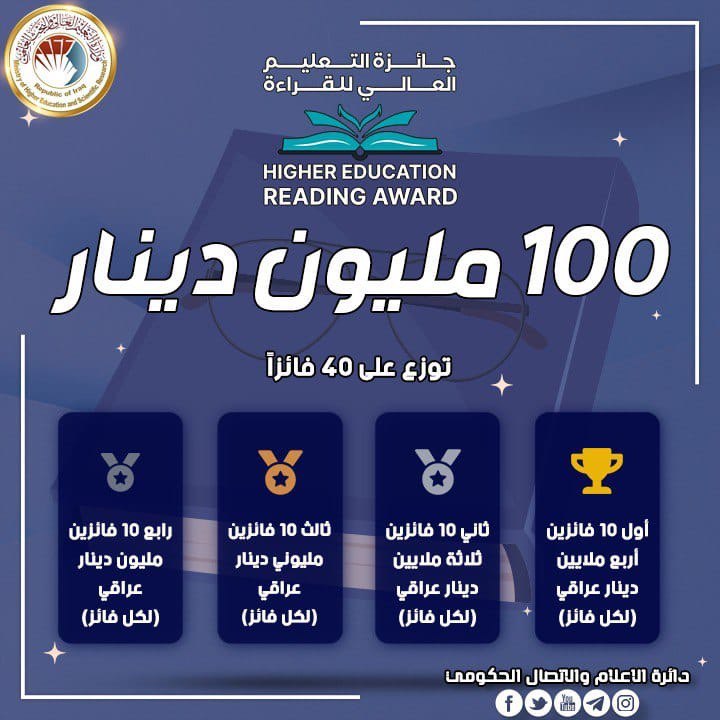 حرصا على توفير المساحة الزمنية اللازمة لتغطية الإقبال على التسجيل في منصة جائزة التعليم العالي للقراءة بنسختها الثانية تعلن اللجنة الوزارية المنظمة في وزارة التعليم العالي والبحث العلمي تمديد موعد إغلاق المنصة (https://awards.mohesr.gov.iq) إلى 2024/10/5 وتحديث موعد الاختبار الإلكتروني ليكون يوم السبت الموافق 2024/10/12 فيما سيكون موعد تكريم الفائزين في 2024/10/24.