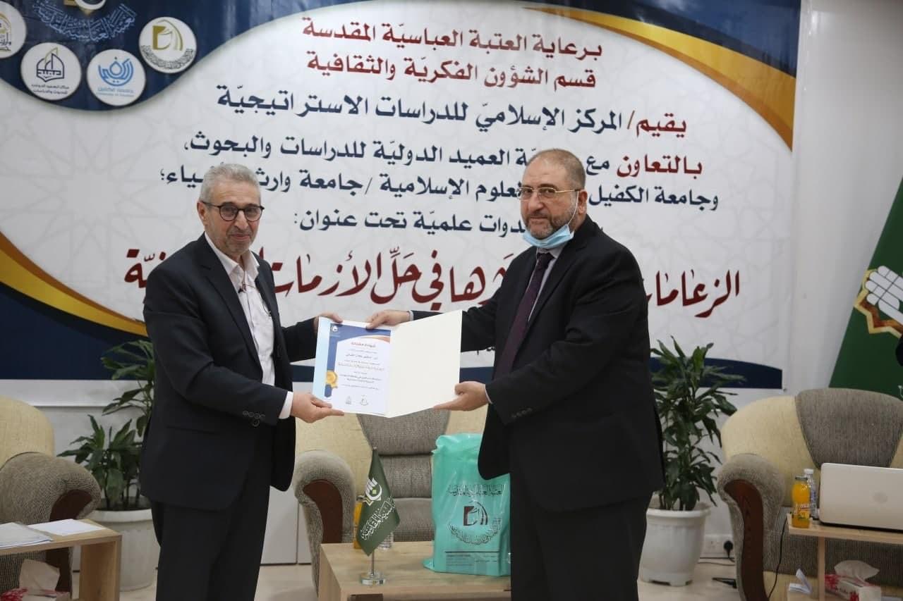 برعاية قسم الشؤون الفكريّة والثقافيّة في العتبة العباسيّة المقدسة وبالتعاون مع كلّيّة العلوم الإسلاميّة في جامعة وارث الأنبياء (عليه السلام) ، اقام المركز الإسلاميّ للدراسات الاستراتيجيّة وضمن سلسلة ندوات الزّعامات الدّينيّة وأثرها في حلِّ الأزمات الإنسانية ، حاور فيها :الأستاذ في الحوزة العلميّة سماحة السـيد رشيد الحسينيّ ، والدكتور طلال الكمالي ، عميد كلّيّة العلوم الإسلاميّة في جامعة وارث الأنبياء (عليه السلام) .