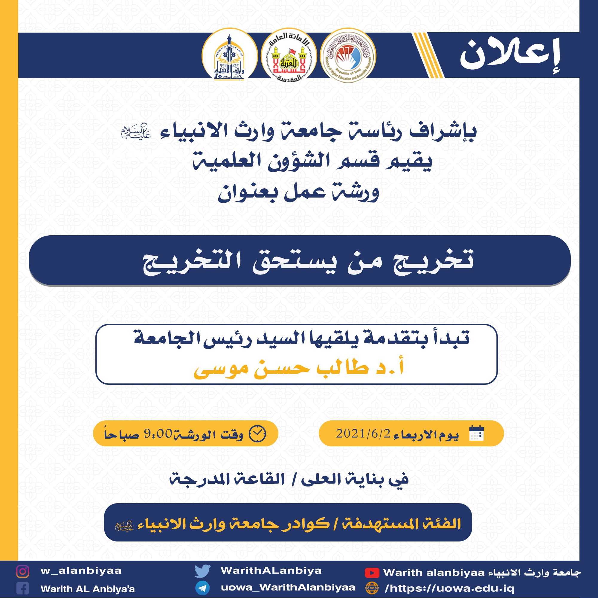 يقيم قسم هندسه الطب الحياتي بالتعاون مع قسم التعليم المستمر في جامعه وارث الأنبياء سلسلة من الحلَقات النقاشية الحضورية ابتداءاً من يوم الأحد المصادف 30/5/2021 و كما في الجدول المرفق.