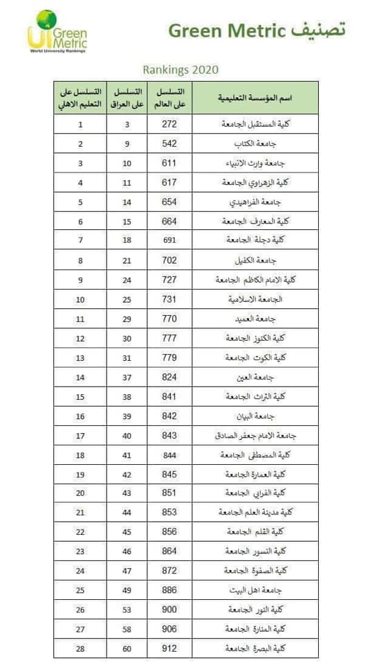 جامعة وارث الأنبياء(عليه السلام) تحصل على المرتبة الثالثة بالنسبة للجامعات الاهلية في التصنيف العالمي للجامعات (UIGreenMetric)