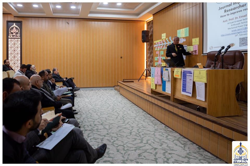 حرصاً من جامعة وارث الانبياء (عليه السلام) على تطوير قابلية التدريسيين في مجالات البحث العلمي ، أقام مركز التعليم المستمر ورشة عمل بعنوان (آليات نشر البحوث الرصينة في المجلات المفهرسة والمحكمة دولياً) ألقاها السيد مدير اللجنة العلمية في الكلية التقنية في المسيب الأستاذ المساعد الدكتور عماد كامل حسين الذي تحدث قائلاً :