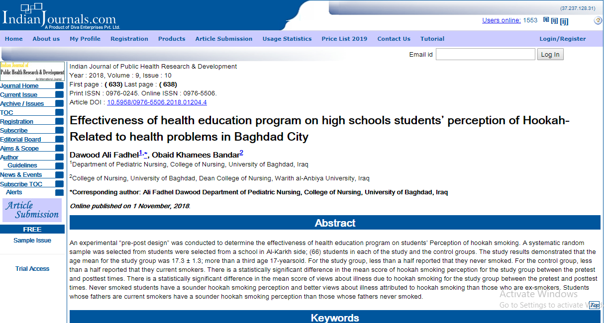 نشر أ.م.د.خميس بندر عبيد السعيدي عميد كلية التمريض/جامعة وارث الانبياء بحثين علميين في مجلة عالمية ضمن موقع (scopus) وهذا يعد حلقه تضاف الى سلسلة حلقات انجازات الدكتور العميد وانجازات كلية التمريض /جامعة وارث الانبياء.