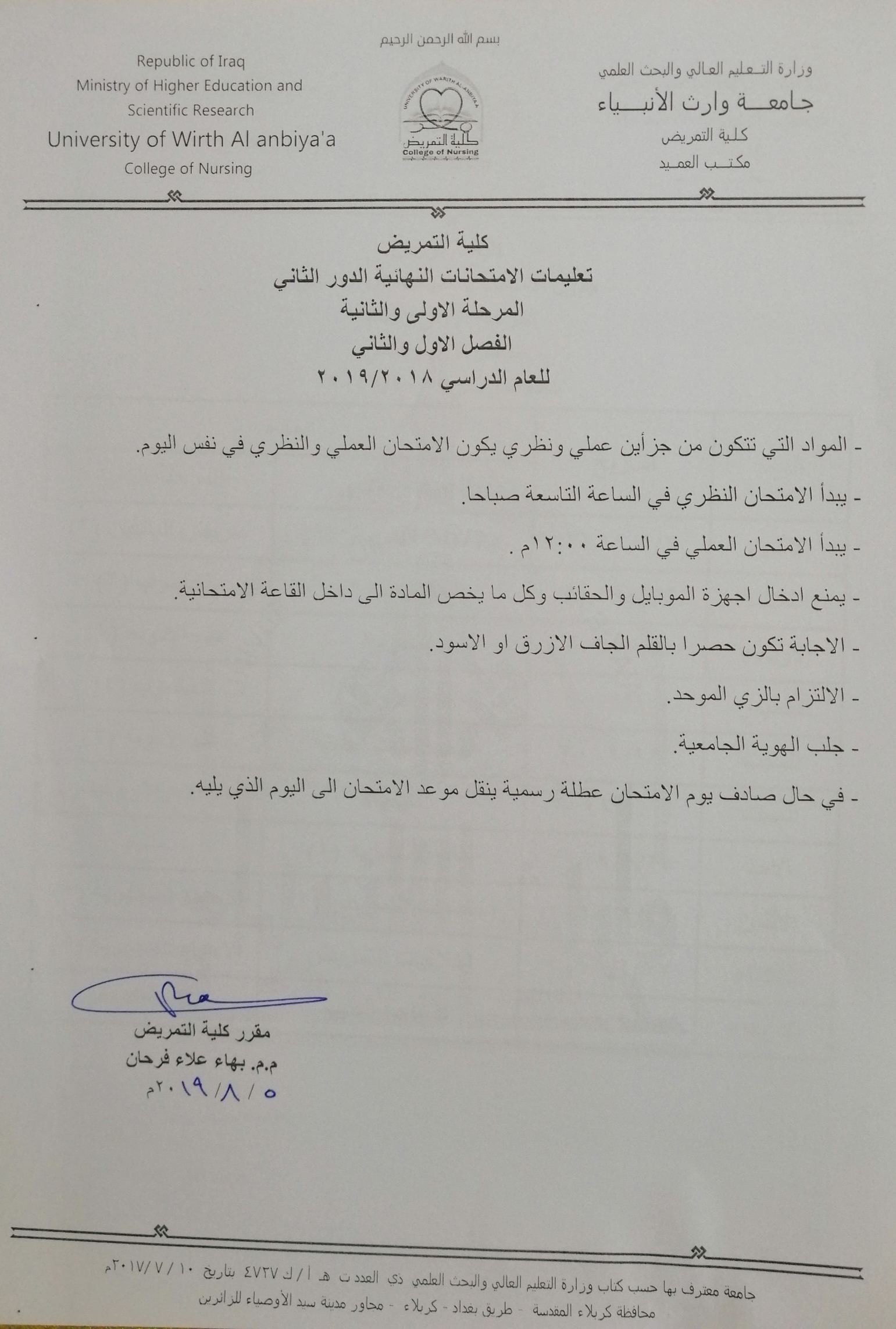 طلبتنا الاعزاء في المرحلة الثانية من سكنة المحافظات التي تقع خارج نطاق صلاحيات صحة كربلاء عليهم مراجعة قسم التسجيل في الجامعة للحصول على كتاب مخاطبة لغرض التدريب الصيفي في المستشفى قرب محل سكناهم.