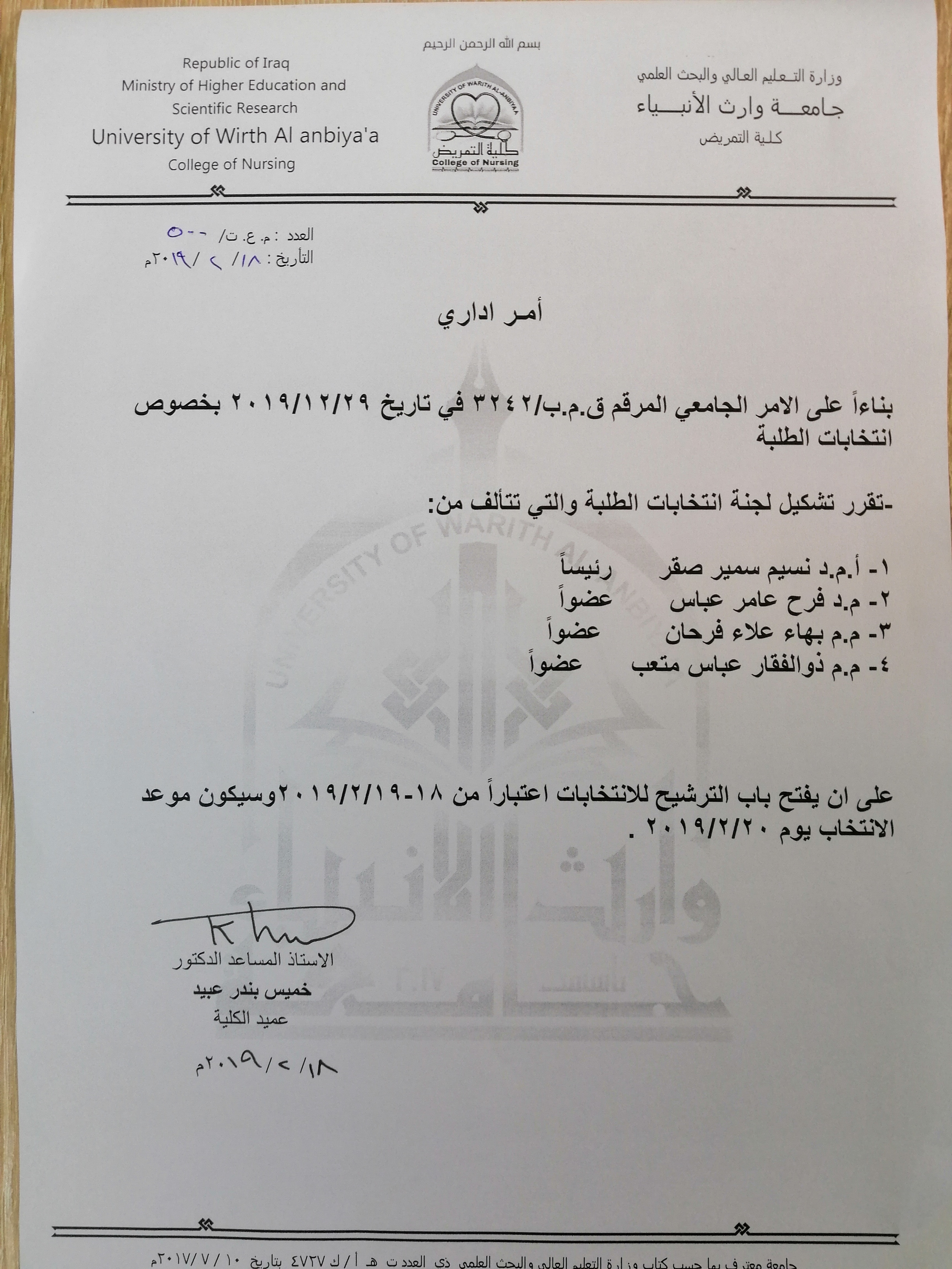 كلية التمريض تعلن عن تشكيل لجنة انتخابات الطلبة.فعلى الطلبه الراغبين بالمشاركه ترشيح اسمائهم الى عمادة الكلية.وحسب ما مبين في الكتاب اعلاه.