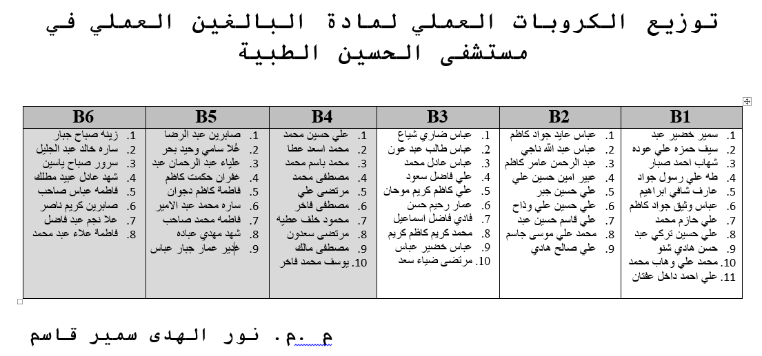 جداول توزيع طلبة المرحلة الثانية على الكروبات لمادة تمريض البالغين العملي في مستشفى الامام الحسين(ع) التعليمي / العام الدراسي ٢٠١٩-٢٠٢٠،