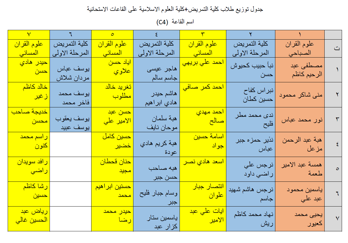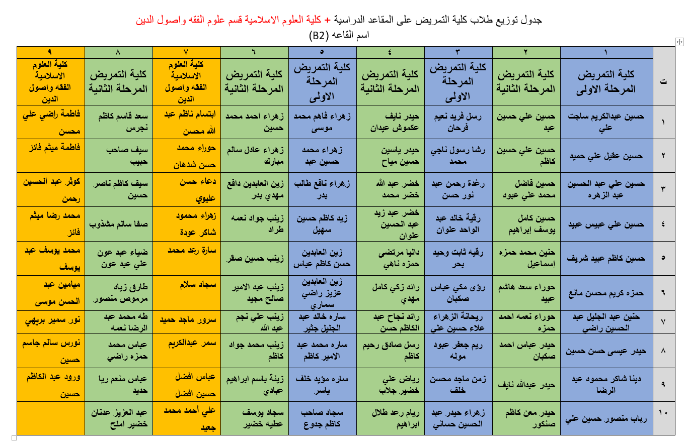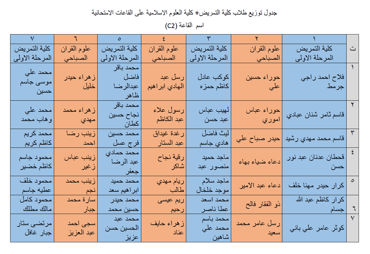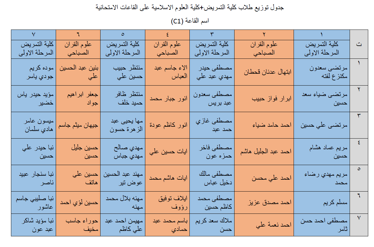 جداول توزيع طلبة كلية التمريض وكلية العلوم الاسلامية على القاعات الامتحانية لامتحانات نهاية الكورس الاول للعام الدراسي 2018/2019.