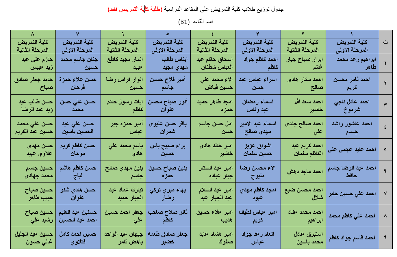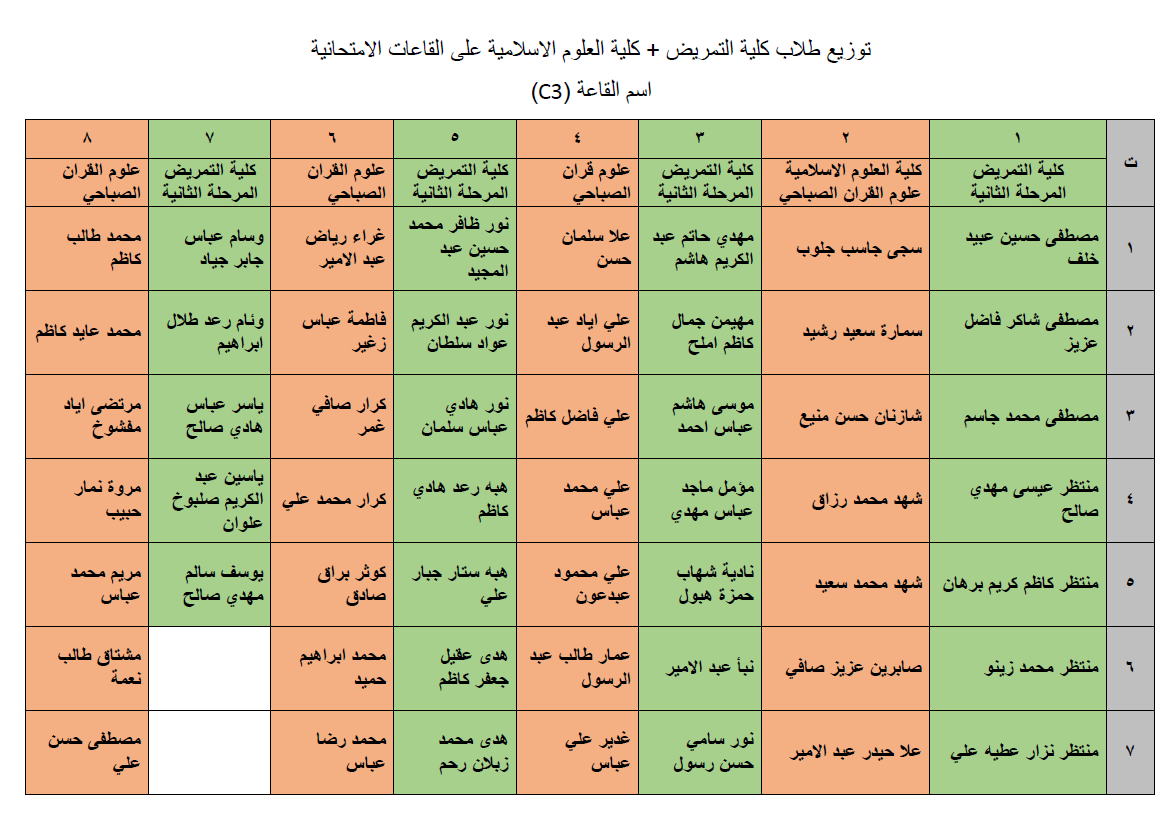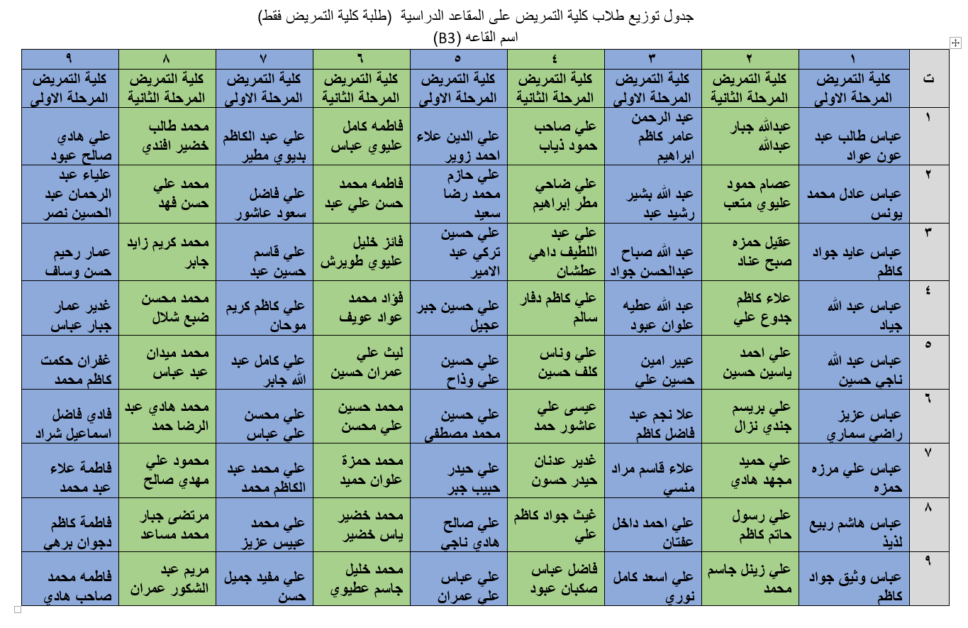 جداول توزيع طلبة كلية التمريض وكلية العلوم الاسلامية على القاعات الامتحانية لامتحانات نهاية الكورس الاول للعام الدراسي 2018/2019.
