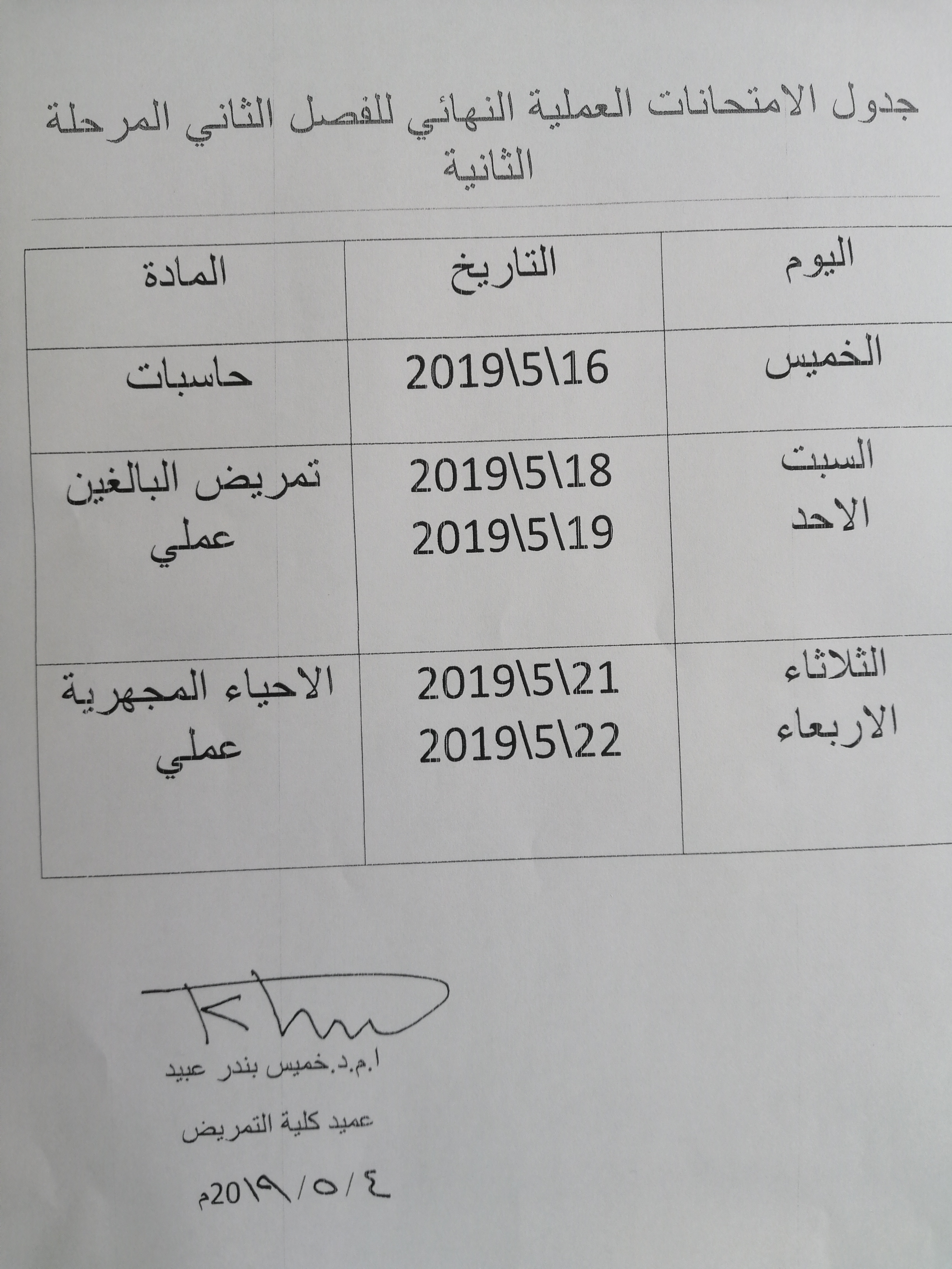 جدول الامتحانات النهائيه العملي للمرحلتين الاولى والثانيه الكورس الثاني ٢٠١٨ /٢٠١٩