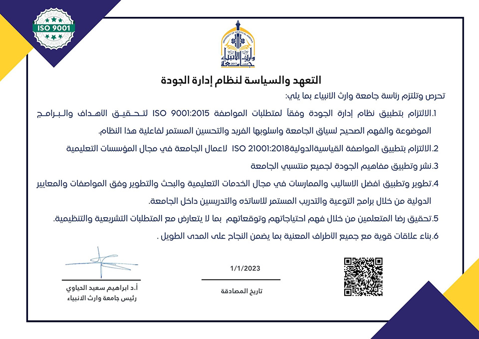 - الالتزام بتطبيق نظام إدارة الجودة وفقاً لمتطلبات المواصفة (ISO 9001:2015 ) لتـحـقيـق الأهـداف والـبـرامـج الموضوعة والفهم الصحيح لسياق الجامعة واسلوبها الفريد والتحسين المستمر لفاعلية هذا النظام.