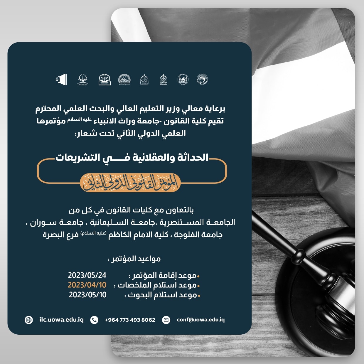 برعاية معالي وزير التعليم العالي والبحث العلمي، تقيم كلية القانون في جامعة وارث الانبياء (عليه السلام) مؤتمرها العلمي الدولي الثاني تحت شعار(الحداثة والعقلانية بالتشريعات) وبالتعاون مع مجموعة من كليات القانون
