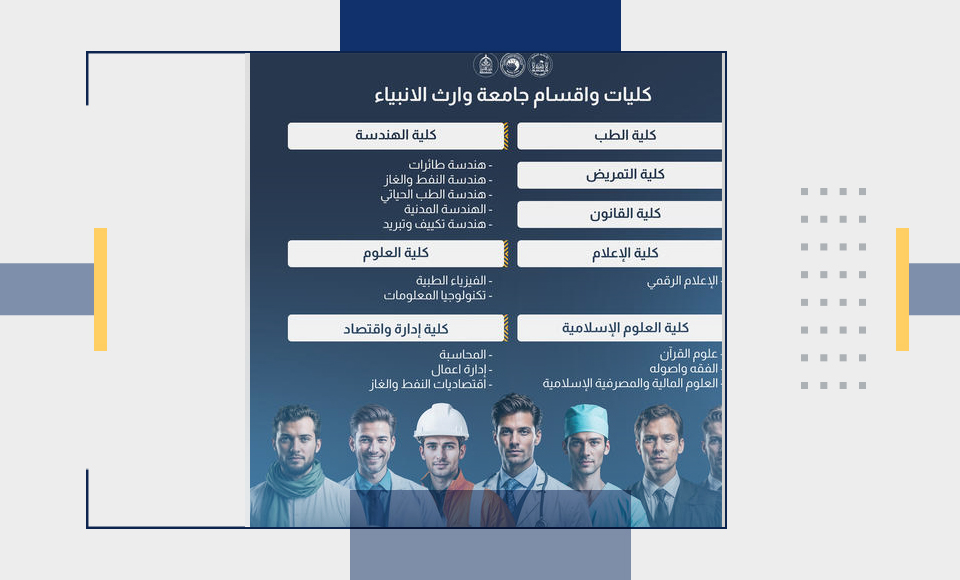 أعلنت جامعة وارث الأنبياء (عليه السلام) عن إتاحة التقديم لخريجي الدراسة الإعدادية الفرع المهني/ قسم المساحة، للالتحاق بكلية الهندسة - قسم الهندسة المدنية. وبهذا القرار، يُمنح الخريجون فرصة متابعة دراستهم الأكاديمية في مجال الهندسة المدنية ضمن الجامعة.