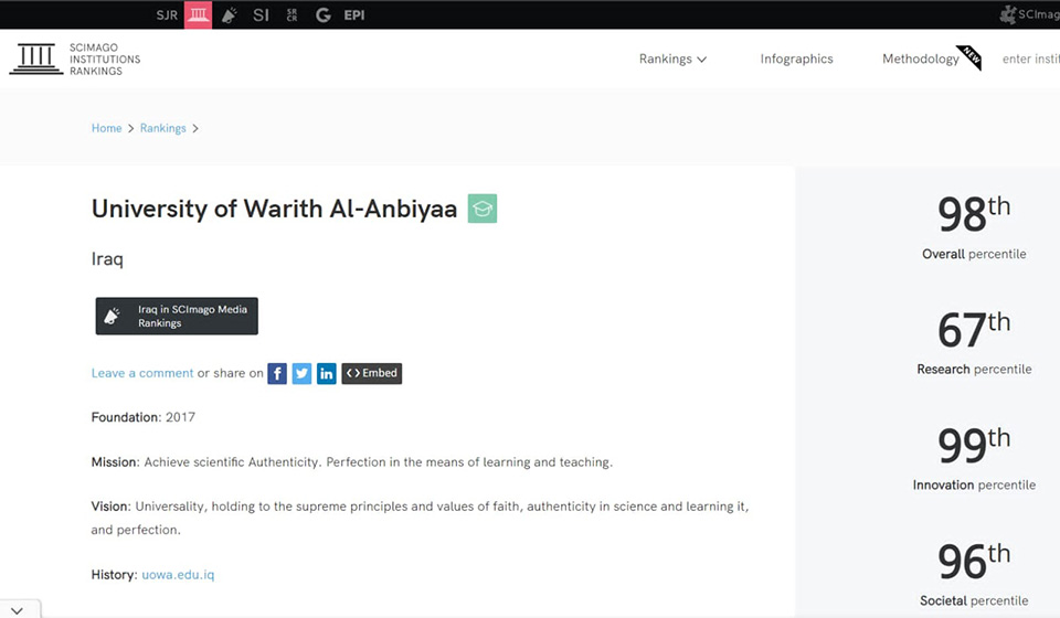 بخطوة نوعية تعكس التزامها بالتميز الأكاديمي والبحثي، تحتفي جامعة وارث الأنبياء (عليه السلام) بإنجازها اللافت في دخول تصنيف Scimago Institution Rankings (SIR)، واحد من أبرز التصنيفات العالمية للمؤسسات البحثية. هذا الإنجاز جاء كثمرة لجهود الجامعة المتواصلة في تعزيز البحث العلمي النوعي وتبني استراتيجيات فعالة لدعم الابتكار والإبداع.